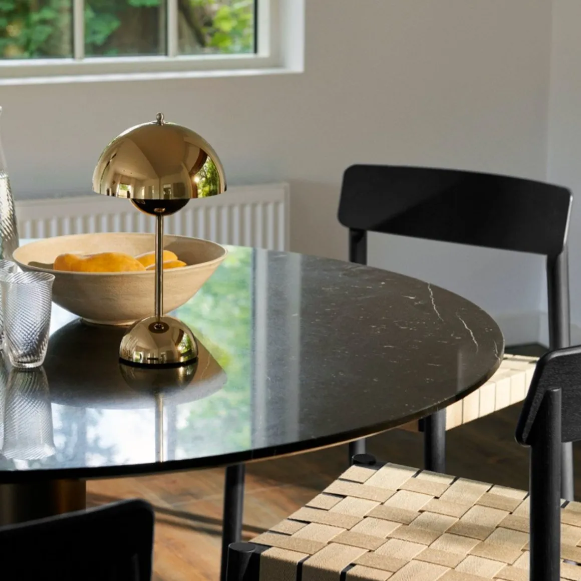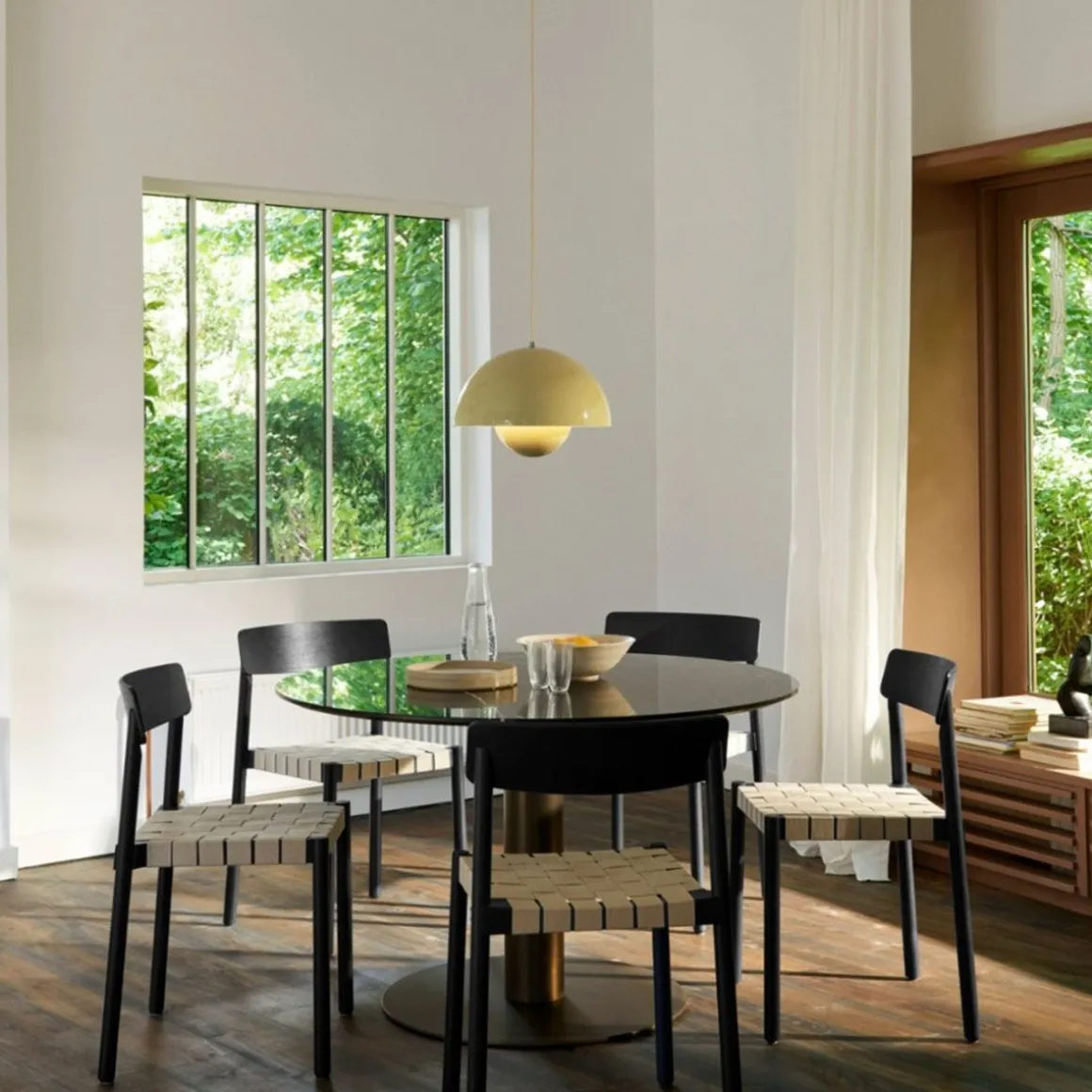 Betty Tk1 de &Tradition par Thau & Kallio. Nommée d’après le théâtre Betty Nansen de Copenhague, cette chaise empilable est disponible en deux versions : une avec une assise en sangles apparentes fabriquées à partir de fibres de lin naturelles et une autre avec une assise en bois massif.