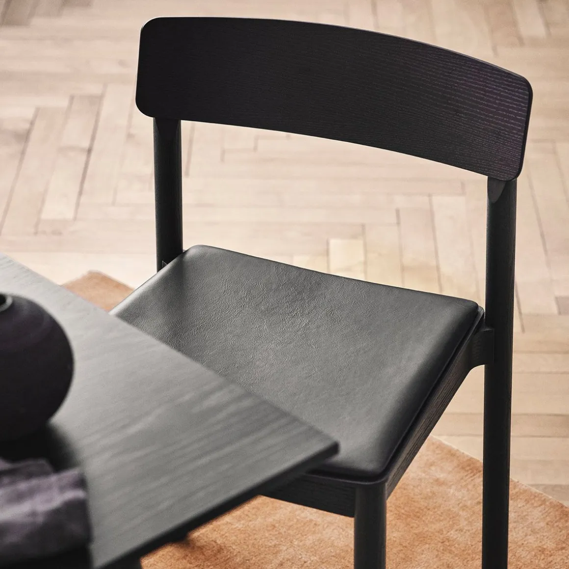 Coloris : Frêne laqué noir/ cuir noir, chêne laqué/ cuir cognac