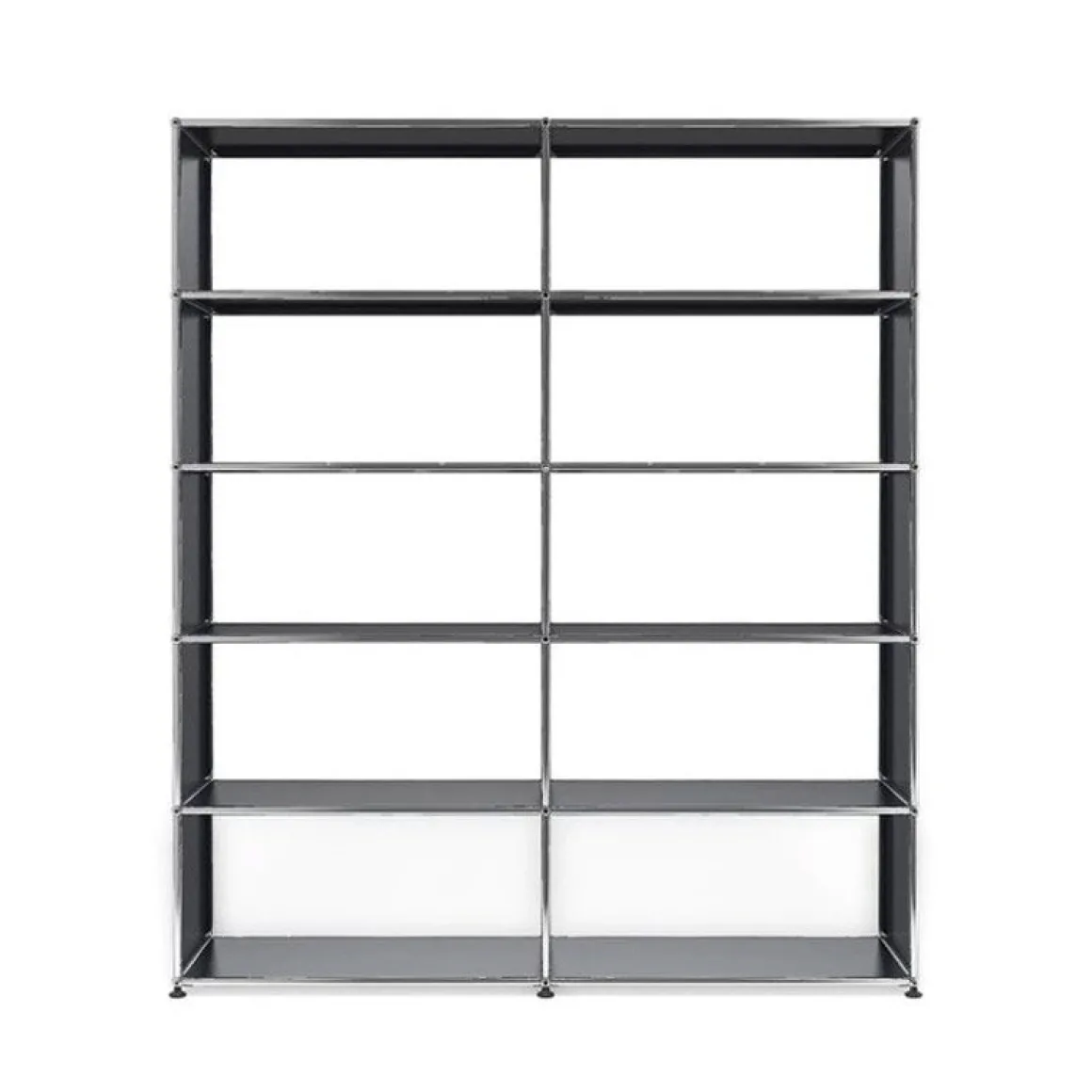 Une boule chromée constitue le centre d’articulation de l’ensemble du système d’aménagement USM Haller. Point de jonction névralgique d’un système de tubes de différentes longueurs elle permet la construction de meubles en 3 dimensions, divers et uniques dans leur forme comme dans leur utilisation. A cette structure porteuse modulaire se rajoutent des éléments de parement en tôle laquée époxy ( 14 coloris) ou en verre, des éléments d’aménagement intérieur et un ensemble de portes ou tiroirs vient terminer la composition. Chaque parement USM peut être de couleur différente.