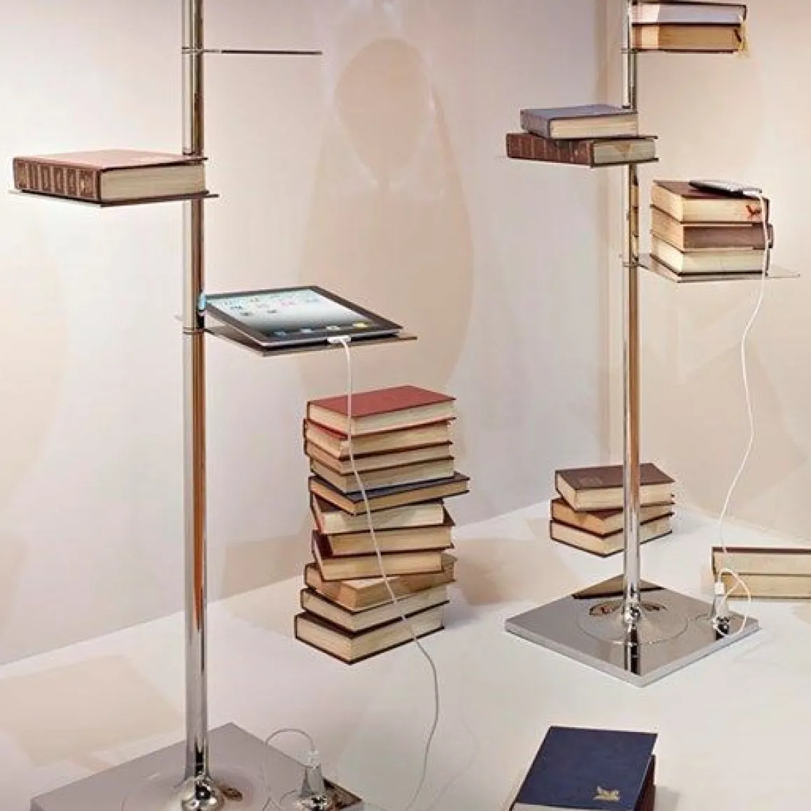 “Une bibliothèque magique où les livres s’envolent vers la lumière.”Philippe Starck Seul un esprit visionnaire comme celui de Philippe Starck pouvait imaginer une lampe de sol comme ‘Bibliothèque Nationale’. Le designer français, comme un magicien contemporain doté de pouvoirs qui animent les objets, imagine une bibliothèque féerique où les livres voltigent et s’envolent vers la lumière. Cette lampe, sans manquer de rigueur formelle et de simplicité, caractéristiques constantes depuis toujours dans la production de Starck, résume pleinement le goût et les besoins qui existent dans notre quotidien, fait d’objets polyfonctionnels et dynamiques. Le designer a pensé à insérer le long de la tige centrale de la lampe, des petites étagères pour recevoir des livres, entre autres. Il a pensé d’élargir ses fonctionnalités en insérant une prise USB qui permet la recharge des smartphones les plus communs. Avoir cette lampe près de soi, nous permettra d’accomplir ainsi nos gestes habituels, faits de longues lectures, cous de fil ou moments de détente maximum. Touche surréelle dans les environnements, ‘Bibliothèque Nationale’ semble exaucer, non sans cette magie qui caractérise souvent les créations de Starck, nos désirs simples mais fondamentaux. Appareil d’illumination de sol à lumière diffuse. Les étagères sont en acier inox brillant. Une prise USB placée sur la base permet la recharge des smartphones les plus communs.