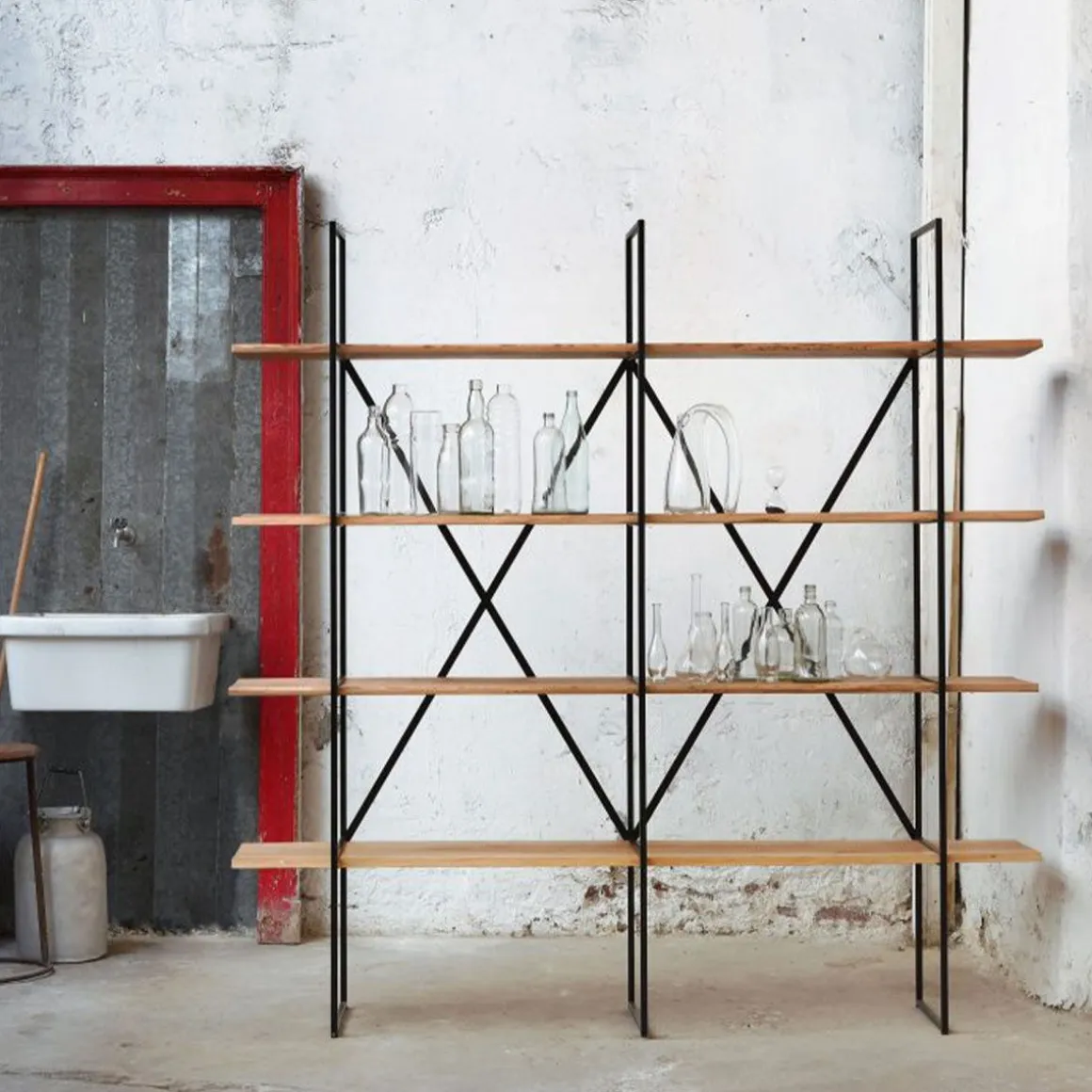 Matériaux : bibliothèque murale démontable avec structure en tube d’acier, peinture en époxy noir cuivré, étagères en bois de peuplier massif poli