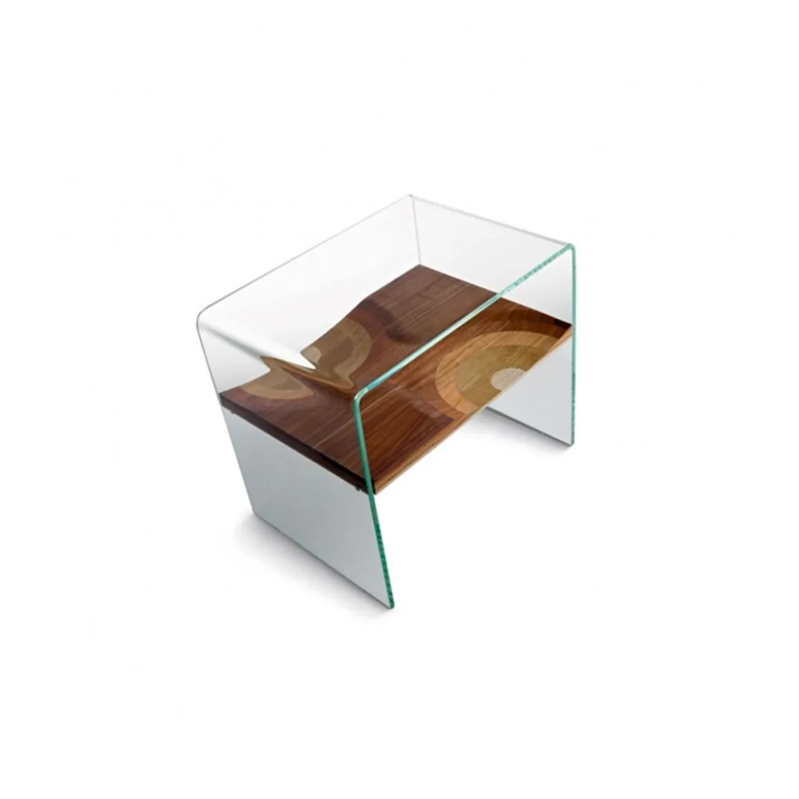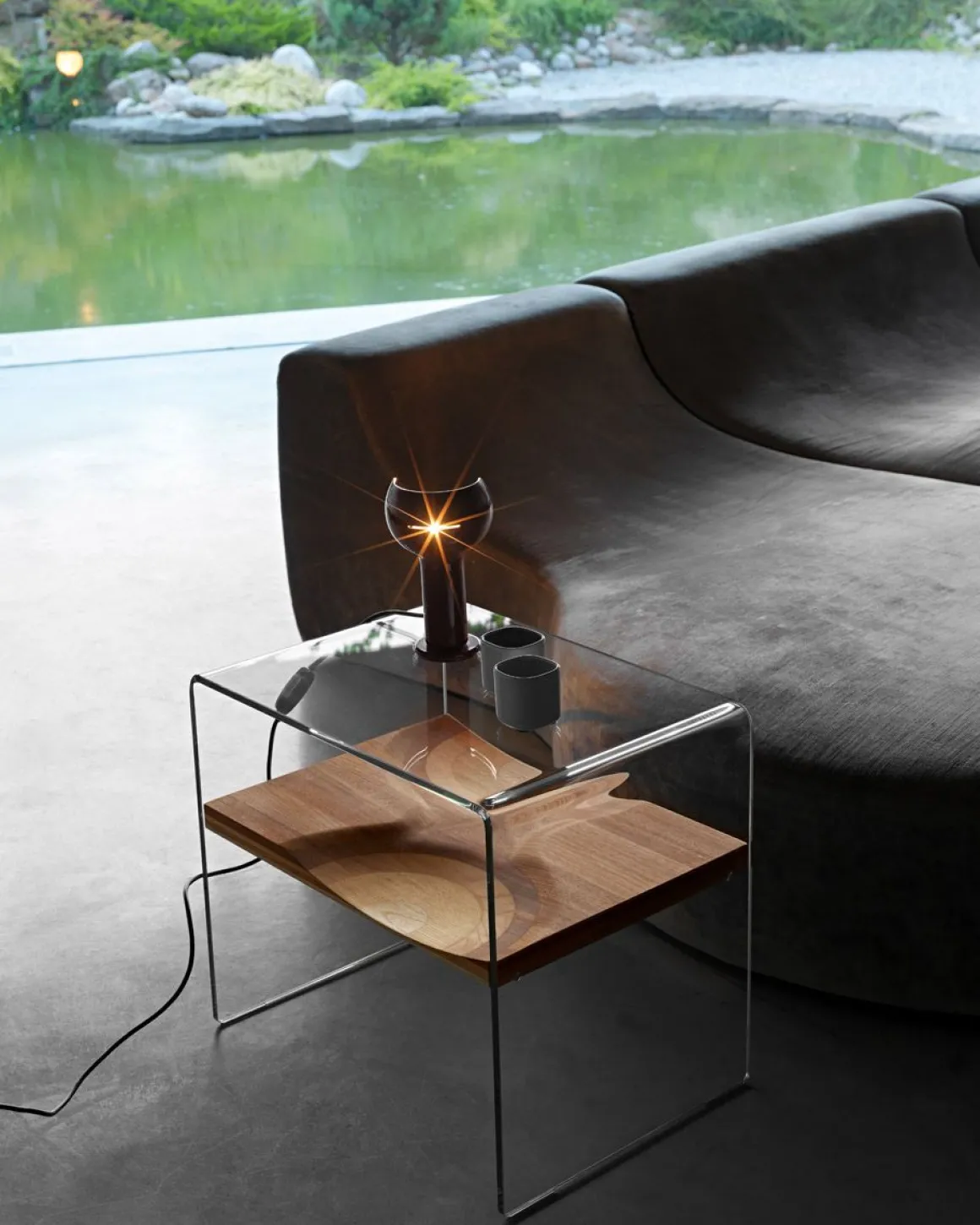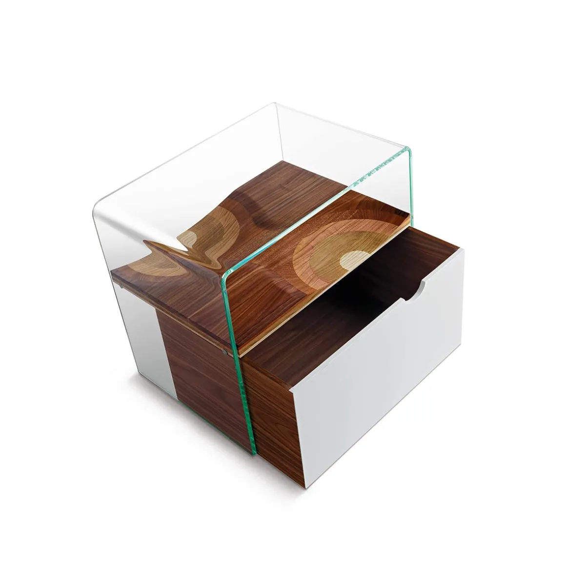 Le banc Ripples par Toyo Ito, vainqueur de la Boussole d’Or 2004, s’est transformé en une collection de différents compléments d’ameublement. Parmi eux, nous pouvons mettre en évidence la table de chevet bifronte, où une petite partie de Ripples est encadrée dans un plateau en verre extra clair, créant un effet « trompe l’oeil » de la suspension mi-air. Bifronte devient une table de nuit avec possibilité d’ajouter un tiroir. La façade du tiroir peut être inversé, chaque face à une couleur différente, l’une en laqué blanc, l’autre en noyer noir.