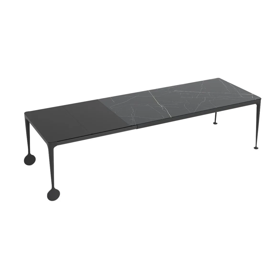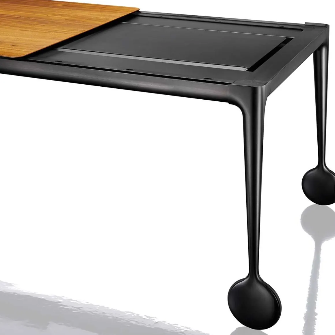 Traverses en aluminium verni, plateaux en noyer naturel et rallonge en MDF laminé verni noir pour modèle noyer ou marbre