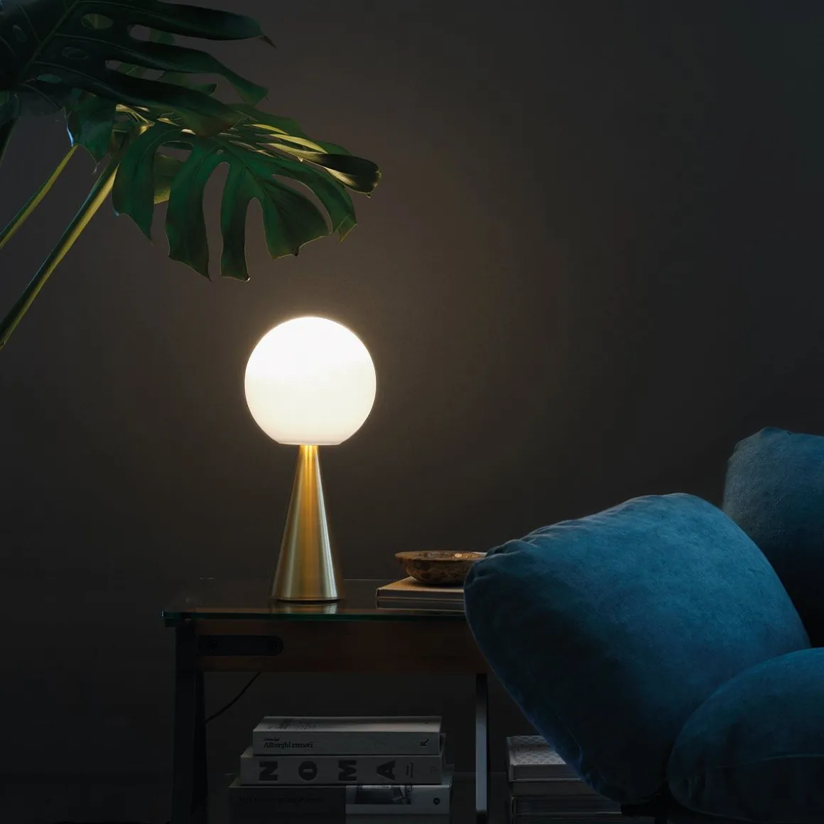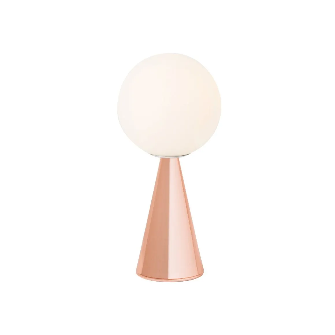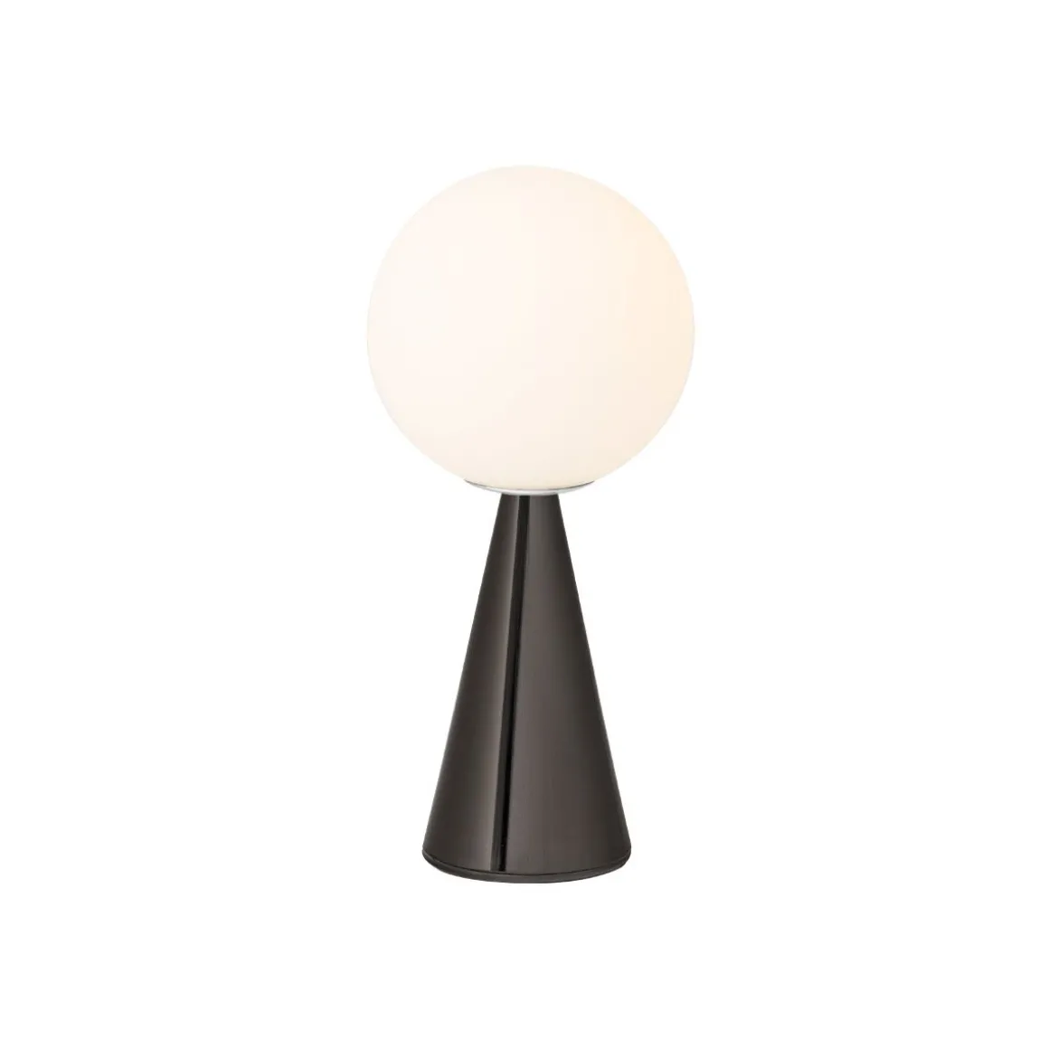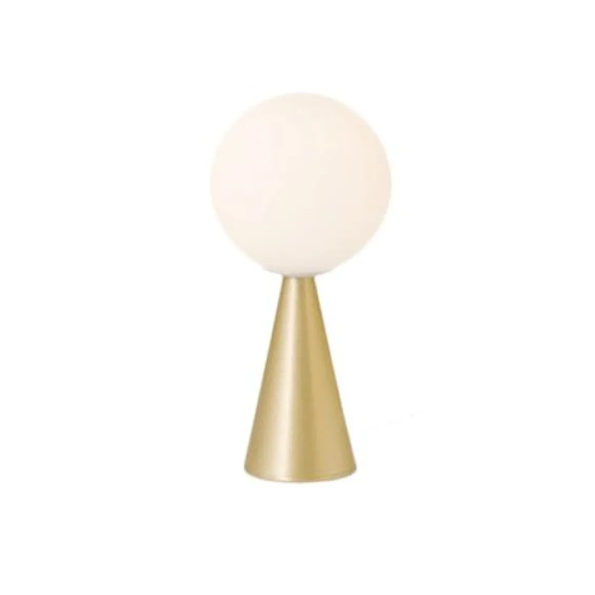 Un cône et une sphère : deux formes géométriques essentielles et identifiables. Une composition simple, qu’enrichissement l’extraordinaire équilibre des propositions et l’élgance discrète des matériaux non réfléchissants : le diffuseur est réalisé en verre soufflé satiné et la structure en métal nickelé brossé. Rien d’autre qu’une boule posée, dans un équilibre apparement impossible, sur un cône qui sert de base. Une des nombreuses magies de composition de Gio Ponti. L’opposition de deux formes géométriques élémentaires donne naissance à un objet original et aux proportions parfaites. La lumière est diffuse et l’émission lumineuse est mise en valeur par l’essentialité géométique du dessin.