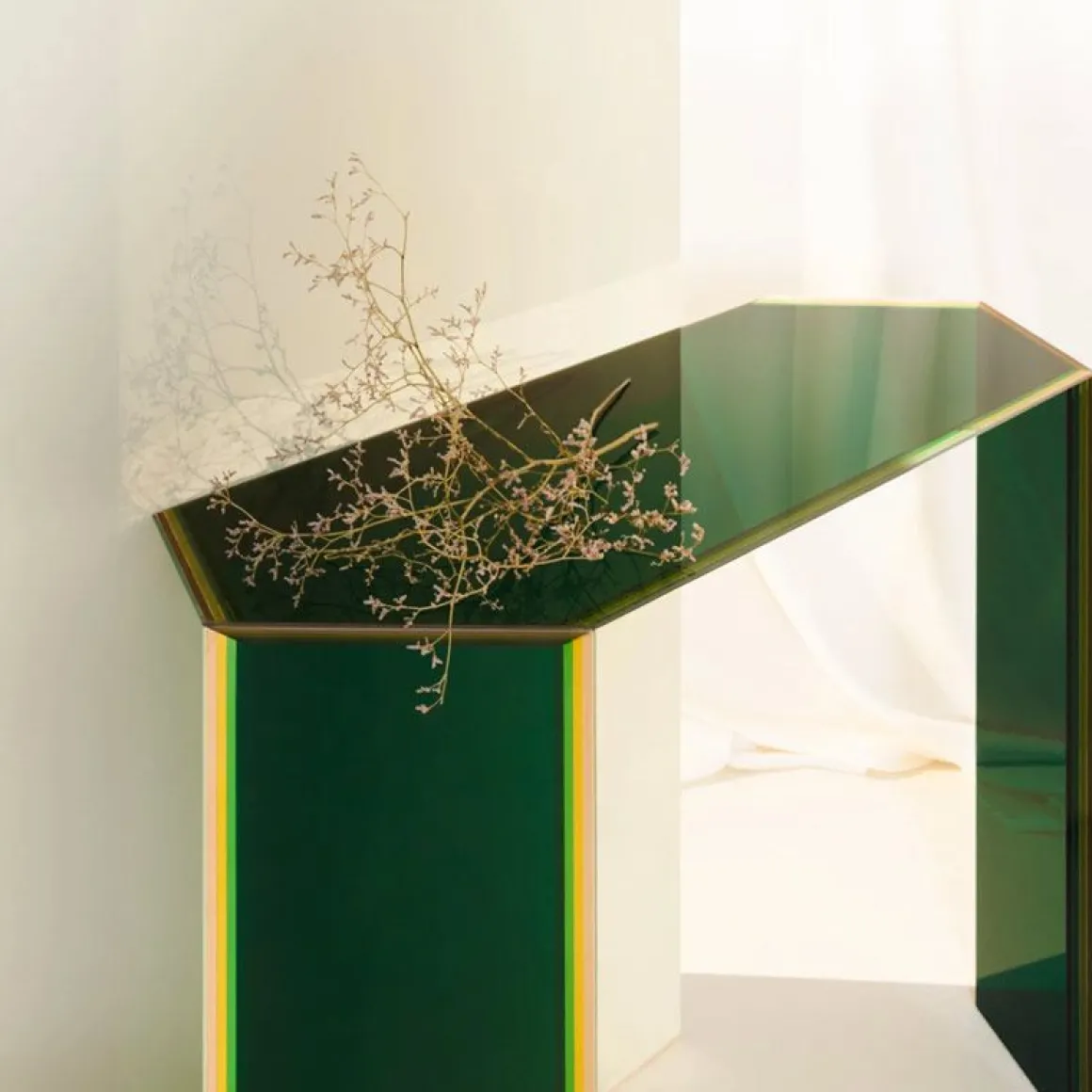Le verre multicouche est de différentes formes, poli au sol brillant et « facetté » au moyen de biseaux uniques accentuant par la transparence du verre l’étonnant matériau multicolore.