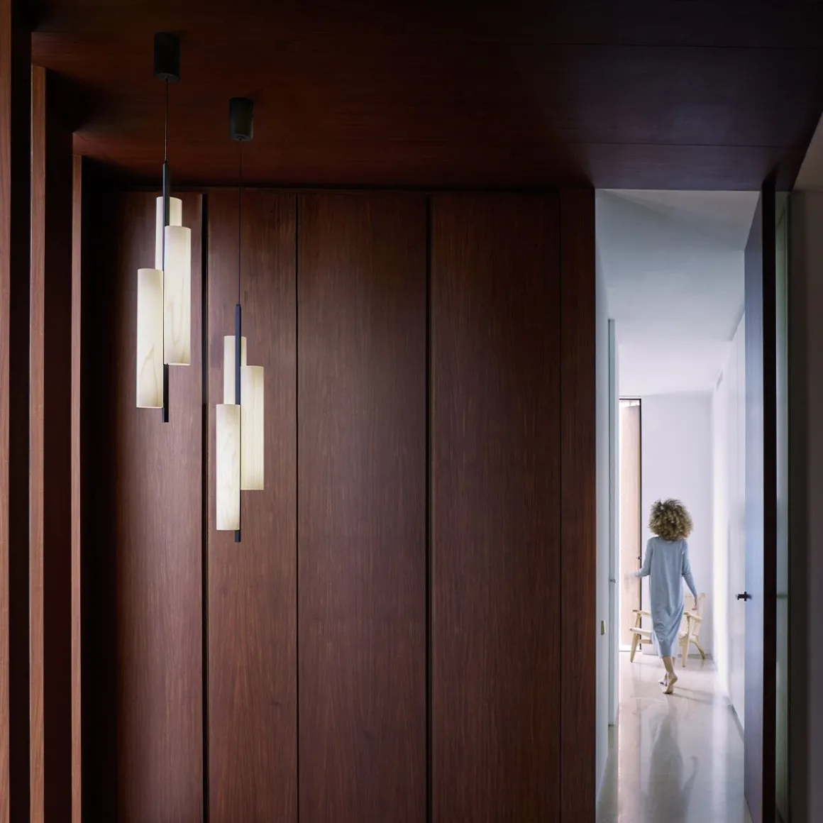 Black Note Triplet LED, la lumière rythmique. Conçue par Ramón Esteve, Black Note est une lampe aux nuances perpendiculaires qui montent et descendent en harmonie. Son arrangement rythmique est inspiré par les touches noires d’un piano, dont les notes aiguës et plates ajoutent émotion et passion à une mélodie. Le cadre métallique de Black Note, fini dans des tons noirs et anthracites, fonctionne harmonieusement avec ses teintes de placage de bois lumineuses et chaudes. Ramón Esteve a créé trois compositions Black Note: Black Note Keys (horizontal), Black Note Triplets (suspension et plancher) et Duplets Black Note (mur). Ces compositions différentes, avec leurs formes rythmiques, offrent une symphonie de lumière, de texture et de motif.