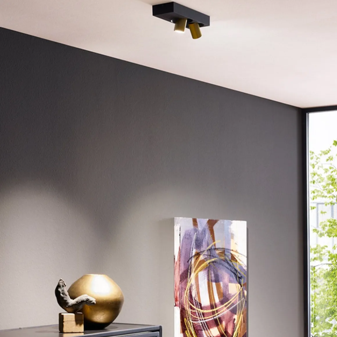 Bliek petit surface 2.0 de Wever & Ducré. Plafonnier apparent avec 2 spots ; en aluminium moulé sous pression, revêtement par poudre. Bague intérieure noire avec technologie COB (Chip on Board) pour une efficacité maximale ; coupure de phase dim ; couleur de lumière colour warm dimming.