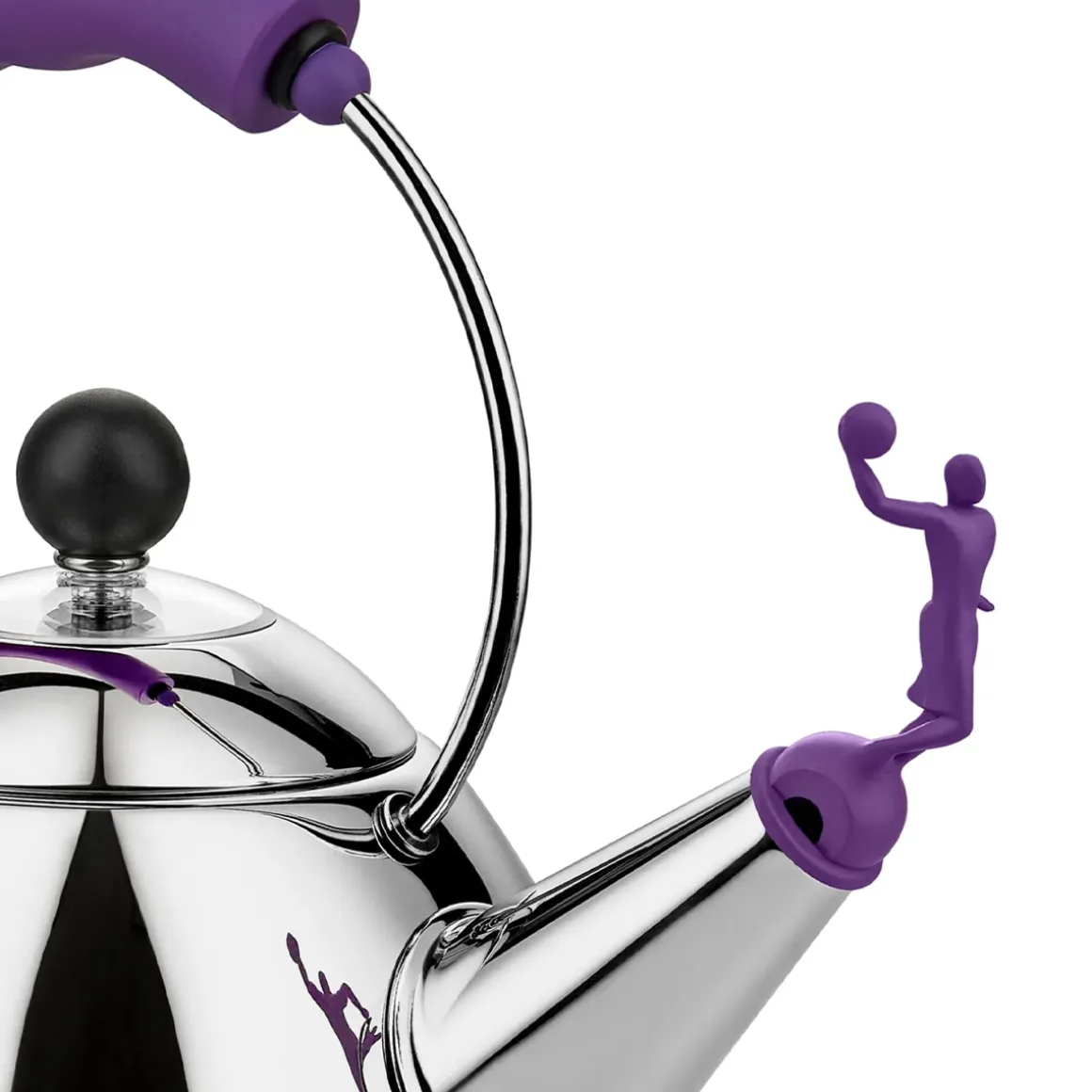 Bouilloire 3909 en édition limitée et numérotée de Alessi par Michael Graves et Virgil Abloh. La bouilloire 3909 mêle différents aspects culturels : le phénomène du basket et son imagerie multiculturelle, partie intégrante de l’histoire personnelle d’Abloh, avec l’univers du design et ses références codifiées. Le sifflet est entièrement repensé, prenant la forme d’un basketteur qui écrase avec puissance le panier, tandis que les couleurs du manche et du pommeau s’illuminent d’un violet intense.