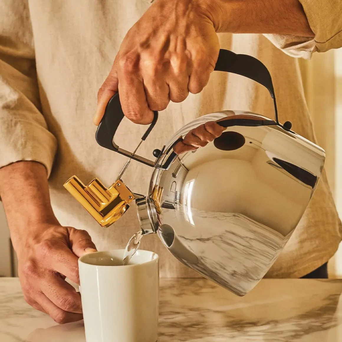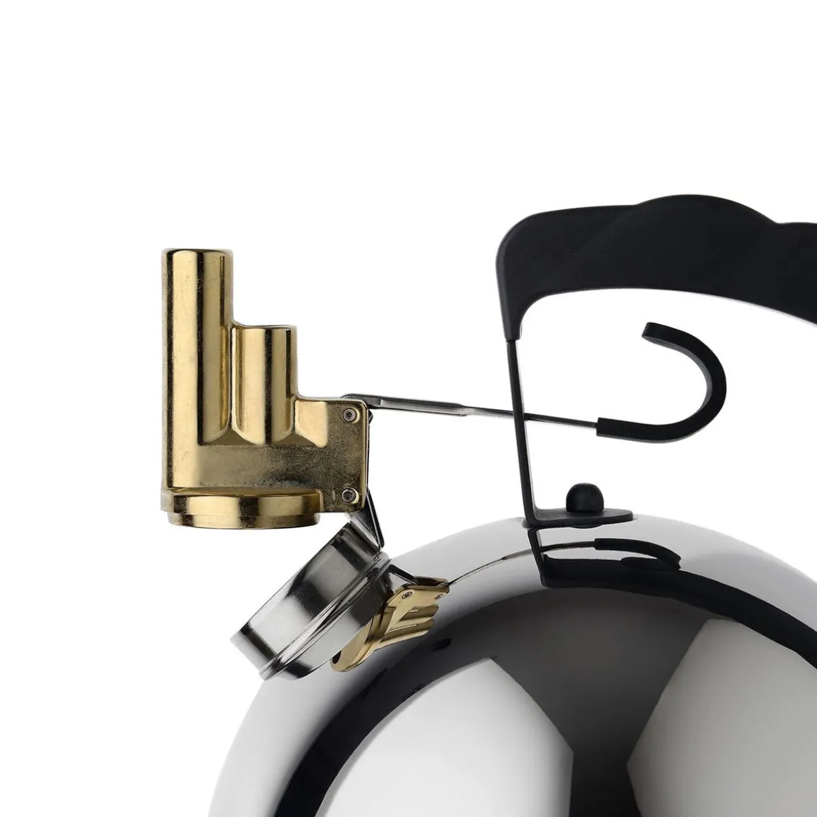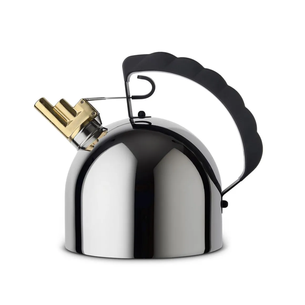 Bouilloire 9091 de Alessi par Richard Sapper. La bouilloire 9091 possède un sifflet mélodique en laiton d’une forme inédite et composé de deux petits évents dans lesquels sont insérés les mécaniques qui reproduisent les notes mi et si. Richard Sapper a créé cette bouilloire inspirée d’un souvenir d’enfance, le son poétique des sirènes des bateaux sur le Rhin : c’est que la mélodie qui accompagne la sortie de vapeur doit être agréable et non anxieuse comme le sifflement des chaudières. Cette bouilloire a induction est un objet polysensoriel qui n’interrompra pas une pause agréable avec un sifflement, mais avec une mélodie captivante.