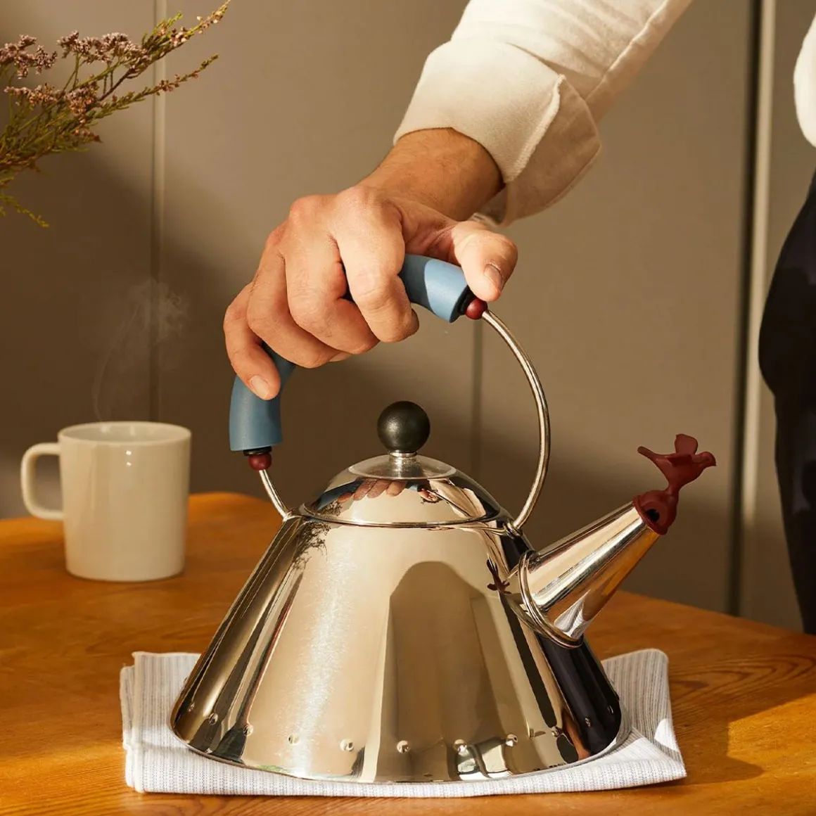 Bouilloire 9093 de Alessi par Michael Graves. La bouilloire 9093, avec un sifflet en forme d’oiseau, est l’un des objets Alessi les plus vendus au monde. Le design de cette bouilloire à induction en acier inoxydable, créée par Michael Graves en 1985, mélange les influences tirées par l’art européen, de la pop américaine et des citations des cultures précolombiennes. Le langage visuel unique de Graves est la raison du succès extraordinaire que la bouilloire a eu depuis l’année de sa production. C’est un objet intelligent, élégant, mais en même temps ludique et amusant : lorsque l’eau commence à bouillir, l’oiseau chante, entraînant un sourire inévitable.