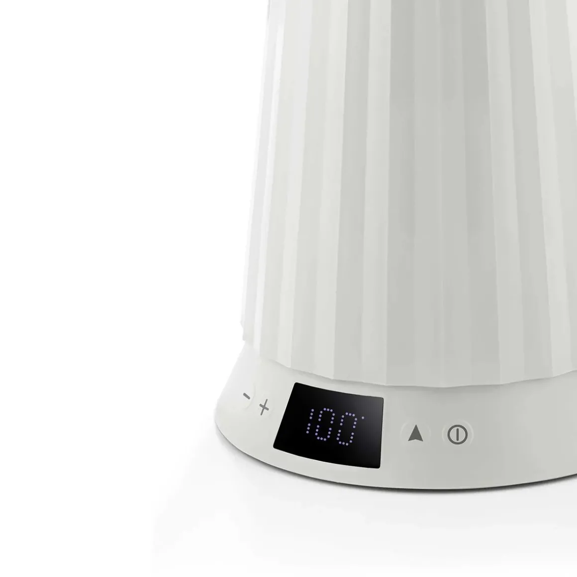 La bouilloire Plissé allie le côté fonctionnel à un design plastique fascinant : comme un tissu qu’un pliage serré transforme en un objet tridimensionnel, cette bouilloire évoque une robe de haute couture. La nouvelle version présente une possibilité de régulation de la température, ce qui élargit les possibilités d’utilisation et offre la solution idéale pour tous les cas où l’eau ne doit pas être bouillante.