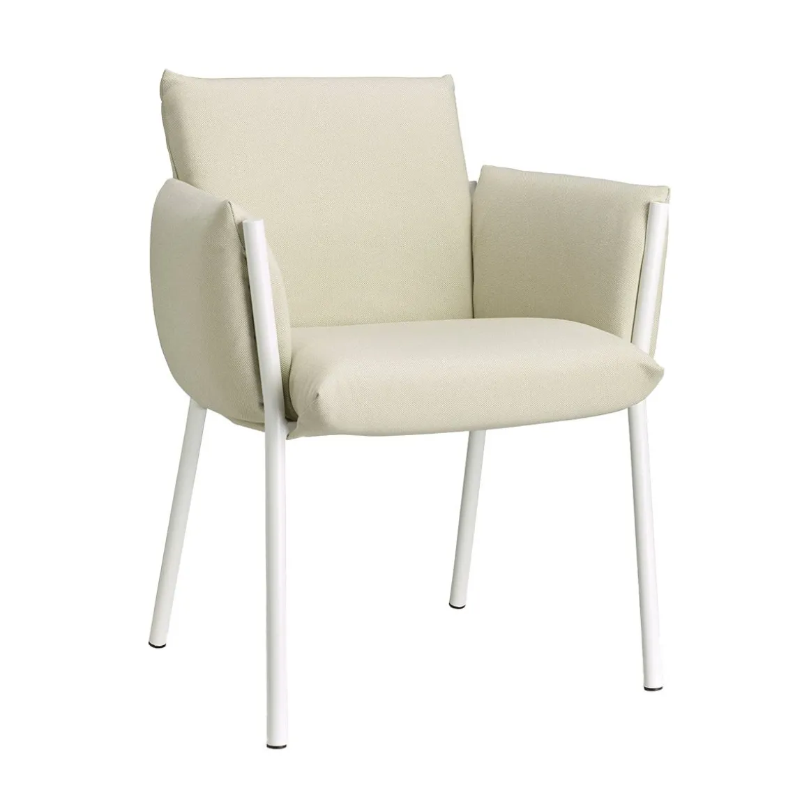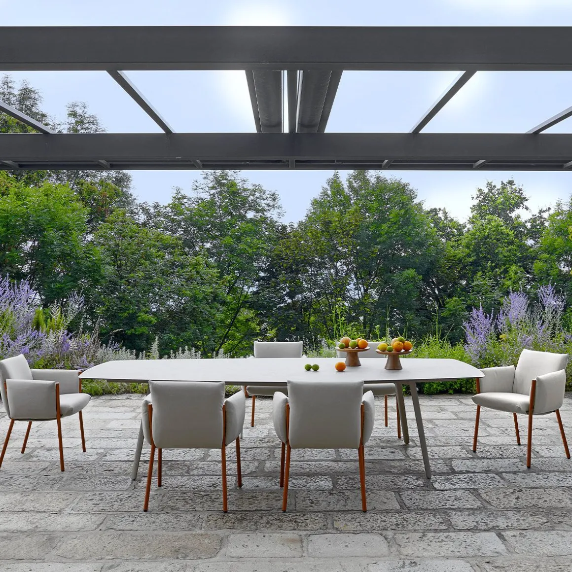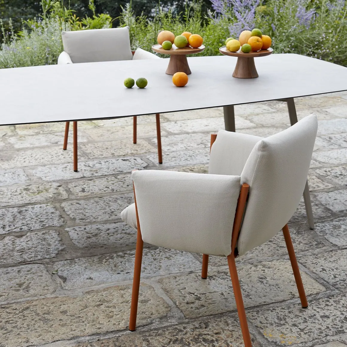 Dans le fauteuil Brezza d’Alessandro Stabile, la structure et les coussins dialoguent d’une manière inédite, alliant solidité, force et élégance innée dans un design conçu pour le confort extérieur. Les parties rembourrées s’enclenchent dans le cadre et se fixent facilement en s’emboîtant les unes dans les autres. Le rembourrage généreux laisse apparaître les pieds ronds en métal, ce qui confère au fauteuil force et recherche. Chez Brezza, la sensibilité écologique réside dans le choix des matériaux : tissus fabriqués à partir de fils recyclés, pas d’utilisation de colles, cadres empilables pour un minimum d’espace pour le transport avec une réduction conséquente du CO2.