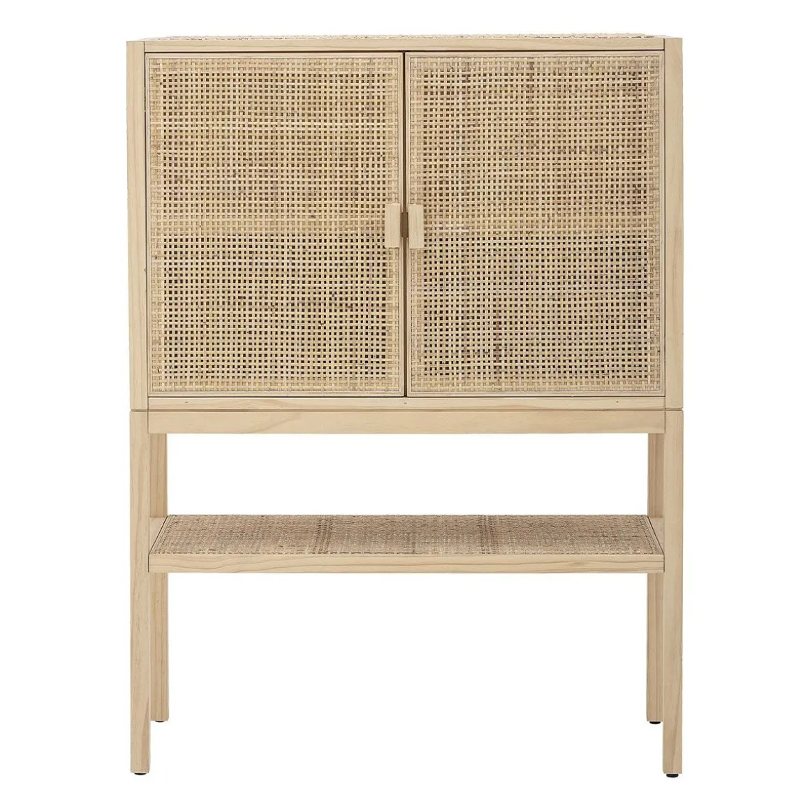 Matériaux : structure en contreplaqué de pin naturel et MDF, cannage de rotin naturel, deux portes avec aménagement intérieur : une étagère avec quatre compartiments