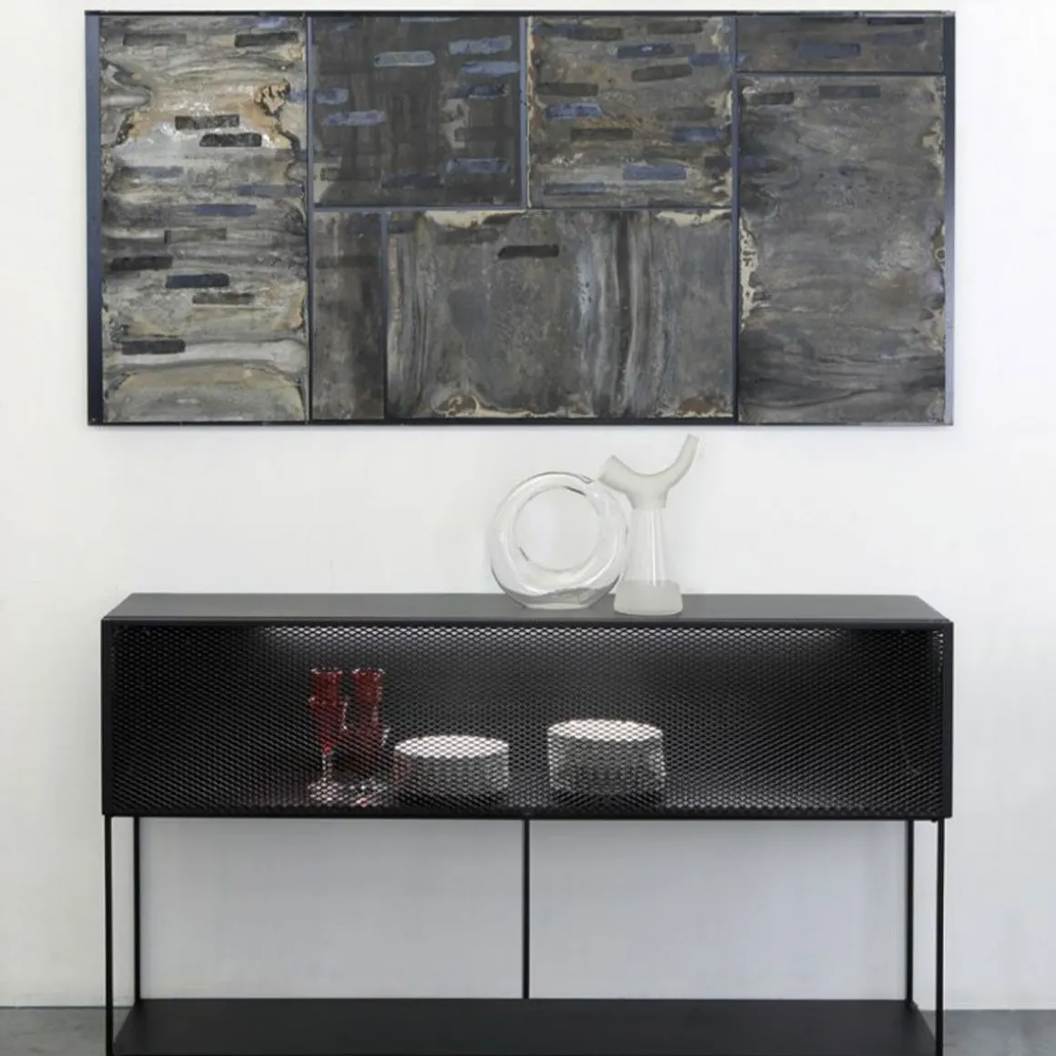 Fabriquée en acier, la collection Tristano combine des surfaces pleines et des surfaces ajourées. La tôle pleine côtoie de la résille d’acier qui forme une texture aérienne et élégante, jouant avec la transparence. Selon le point de vue de l’observateur, la résille métallique laisse passer la lumière et le regard ou au contraire, le retient… Ce buffet à la forme simple et épurée est une incarnation moderne de l’esthétique industrielle. Le buffet Tristano est muni d’un grand compartiment fermé par une porte abattante en résille de métal (fermeture magnétique). Translucide, la résille de métal dissimule partiellement le contenu du buffet, ne permettant pas de distinguer nettement les contours des objets.