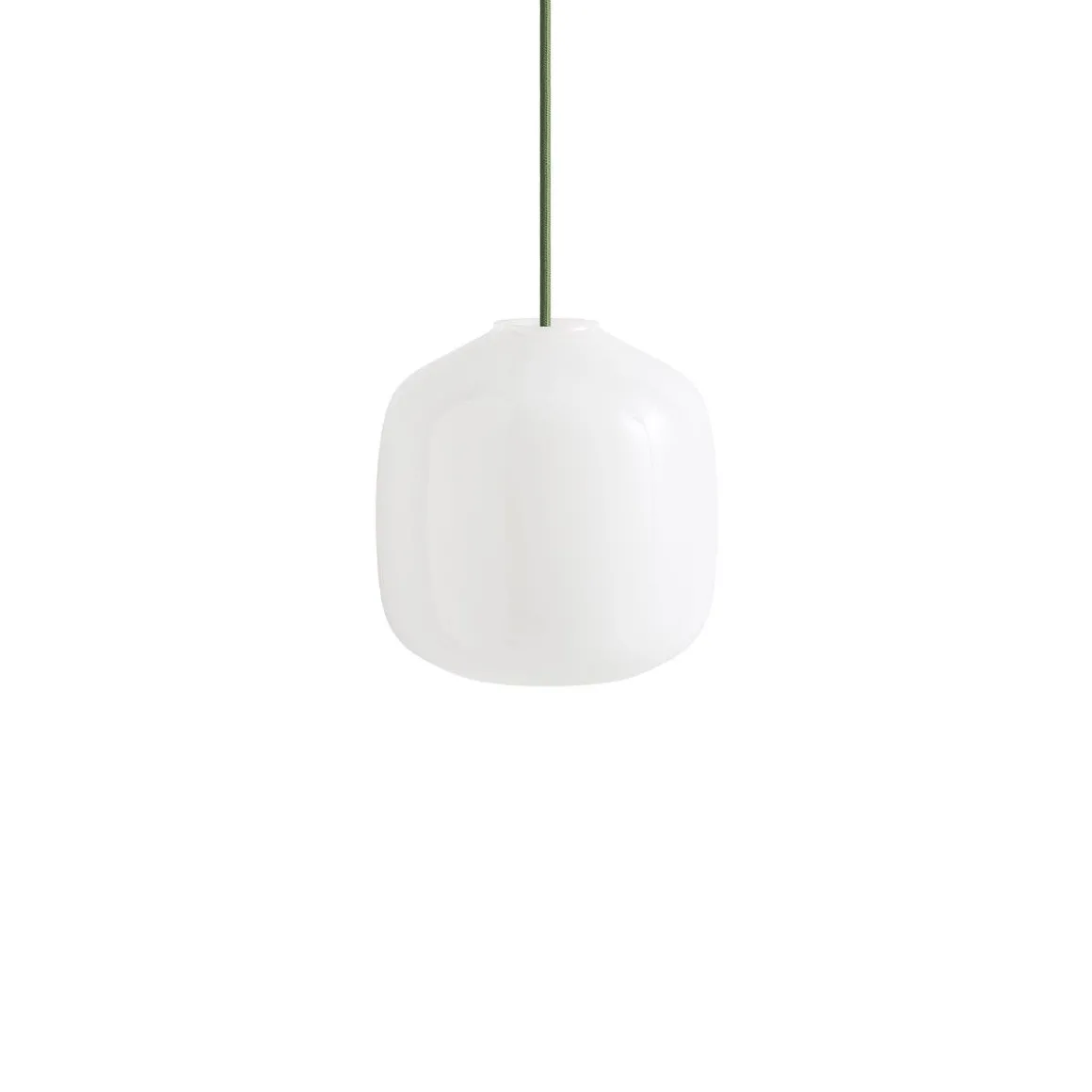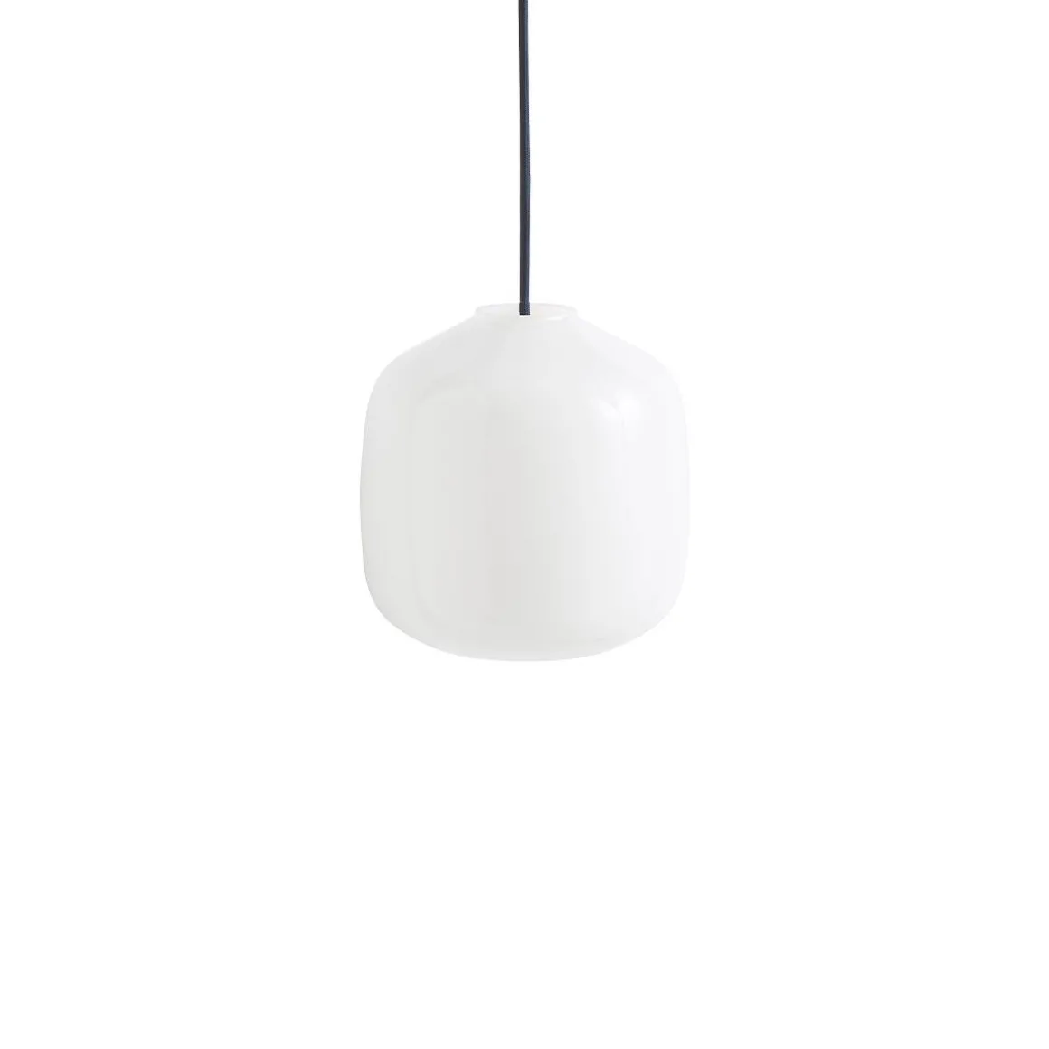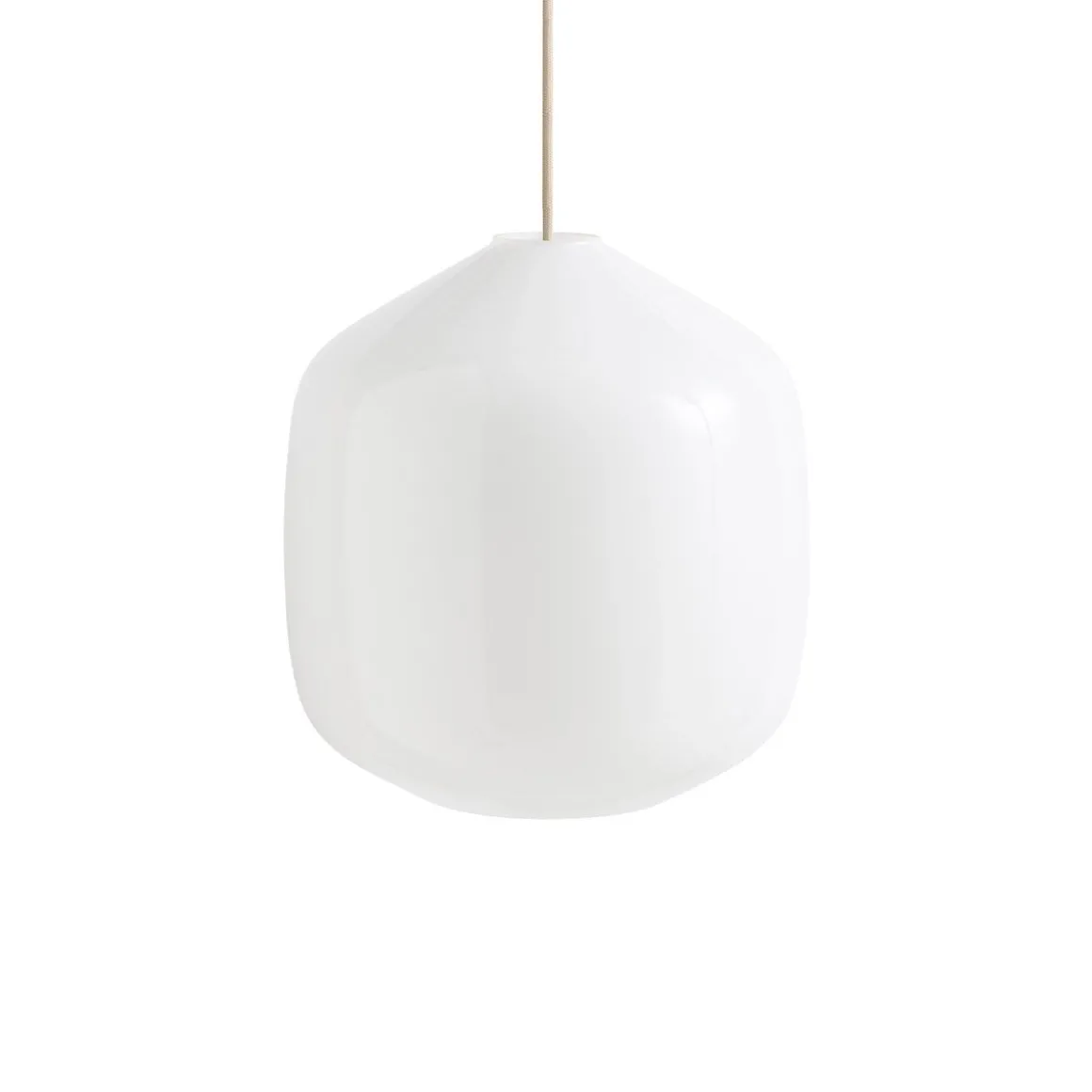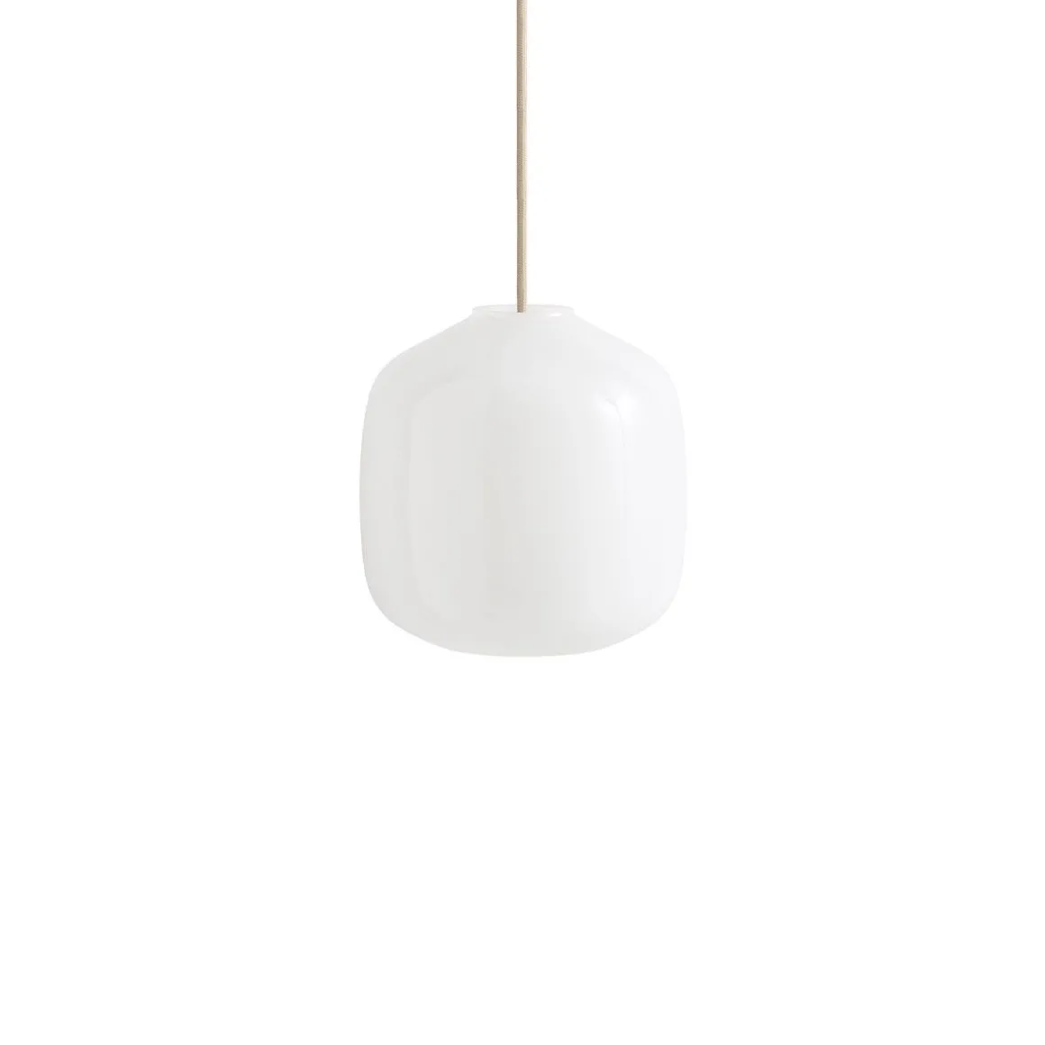 Matériaux : verre soufflé opale blanc, câble en tissu tressé avec isolation en silicone