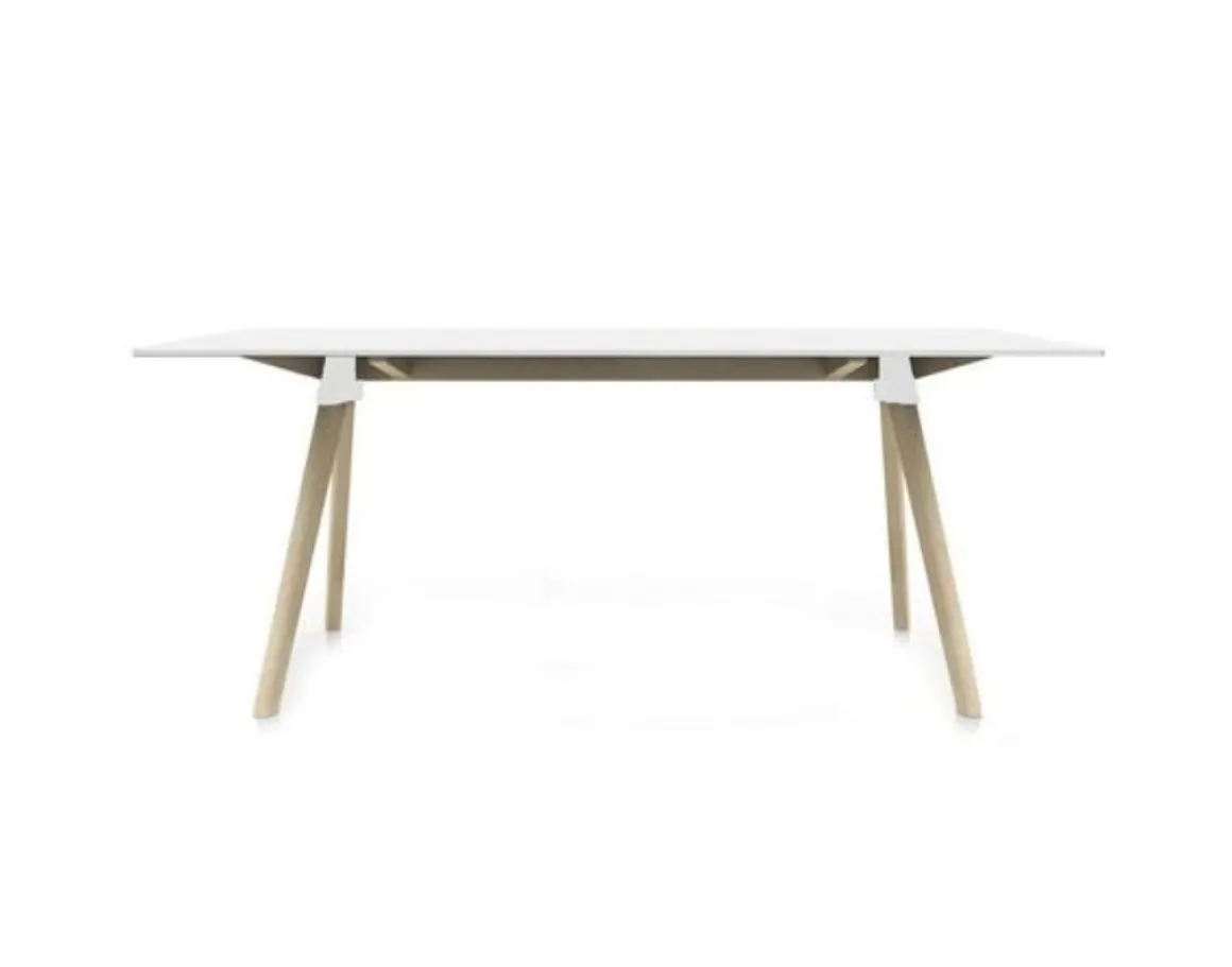 La table Butch s’adapte à tous les styles d’intérieurs, cette table de repas peut parfaitement faire office de bureau. Ses lignes inclinées et sobres à la fois donnent l’impression que ses matériaux s’imbriquent de façon très naturelle. Le plateau et les joints colorés atténuent l’effet de son design sophistiqué. Elle associe des pieds en hêtre massif naturel à un plateau coloré noir ou blanc, réalisé en HPL. Les jonctions entre les pieds et le plateau sont en polypropylène coloré. Avec son style sobre, cette table aux lignes épurées possède une présence contemporaine grâce à sa combinaison de matériaux.