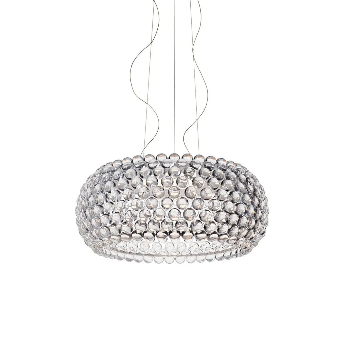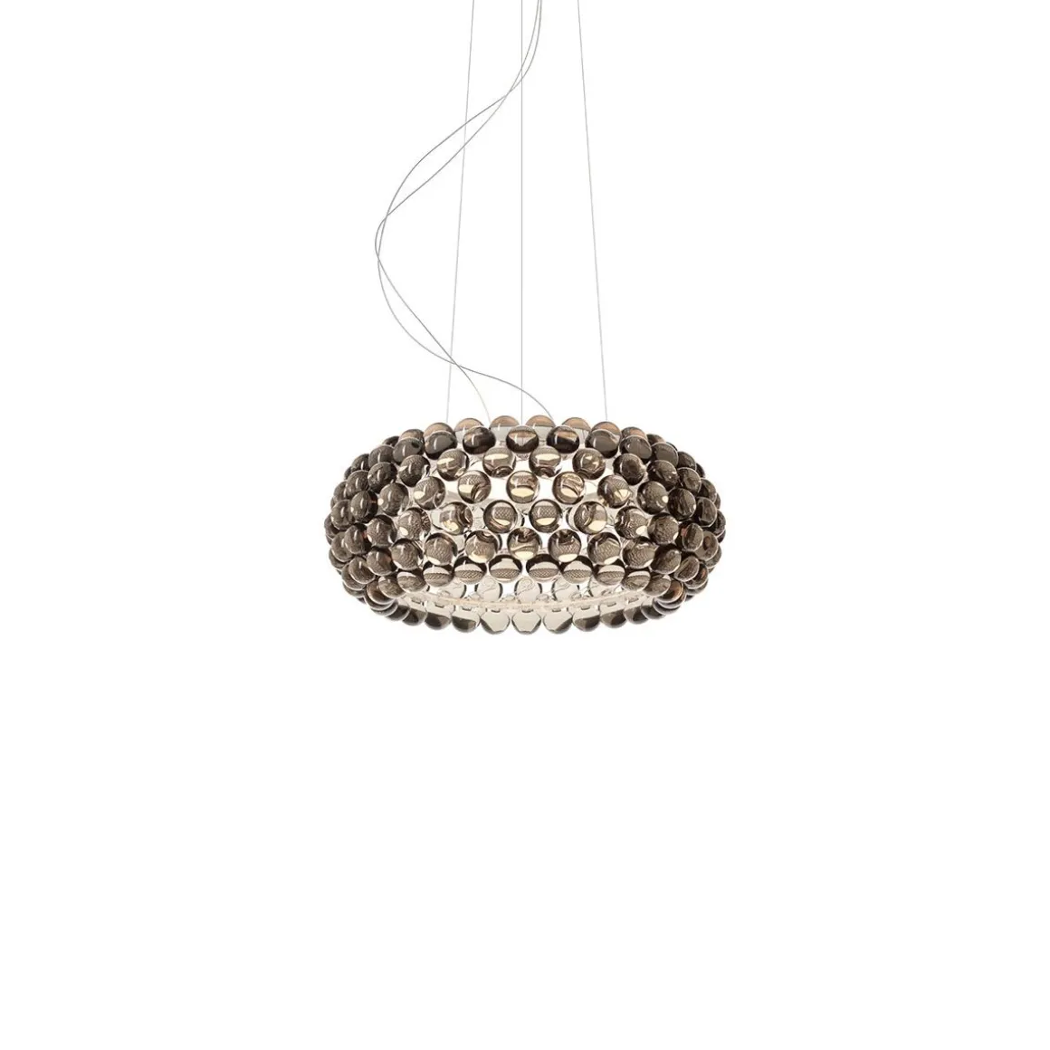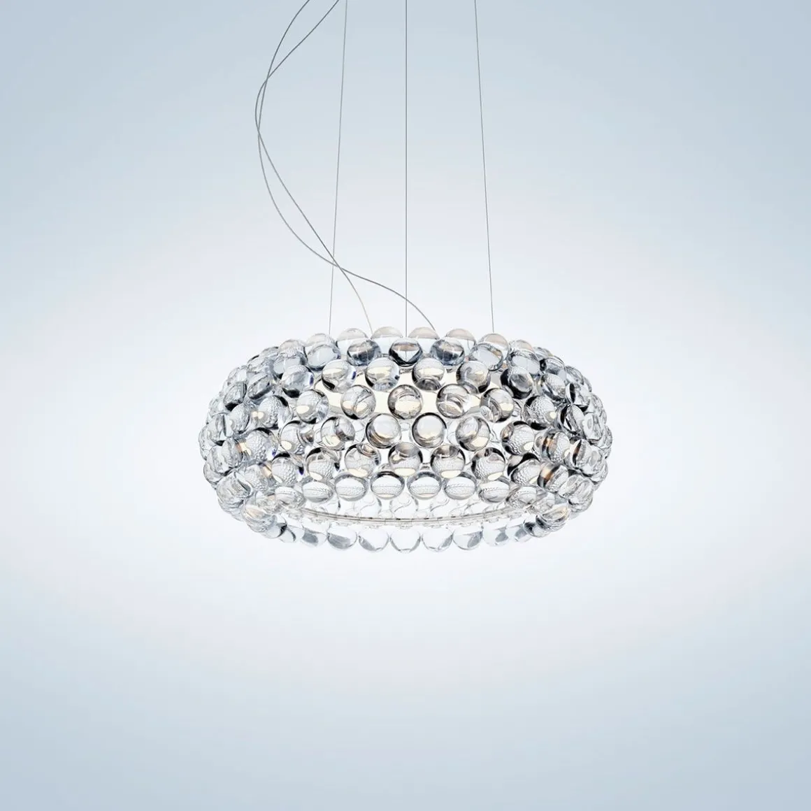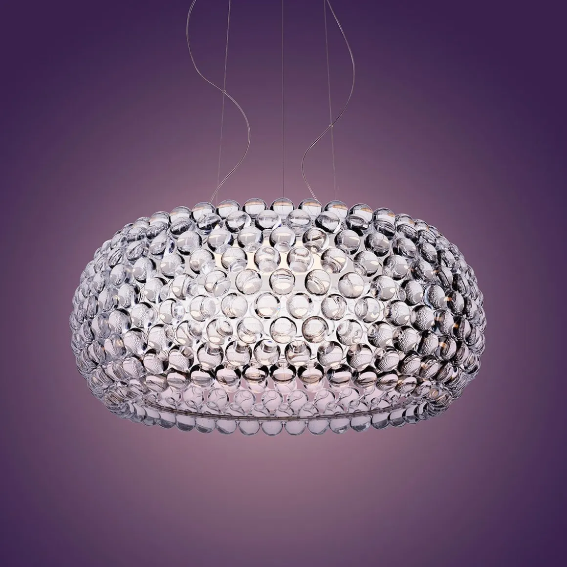 Lampe à suspension à lumière diffuse. Structure comprenant arceaux PC transparents, sur lesquels se trouvent des sphères PMMA appliquée, en utilisant le nouveau système de verrouillage par rotation. Le corps de la lampe se compose de deux tôles d’acier revêtues de poudre, qui incorpore la LED double face, qui est protégée par le haut par un petit disque en PMMA opalin et en bas par un diffuseur en PMMA satiné. Suspension à trois points système avec câbles en acier. Auvent de plafond blanc. Choix de LED disponible, variable ou non.