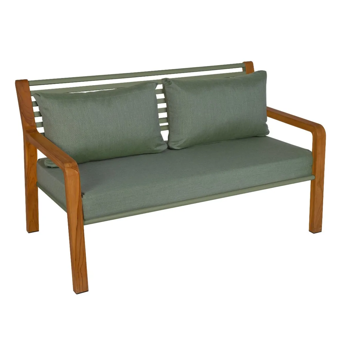 Le canapé 2 places Somerset vous évoque des souvenirs de vos séjours outre-Manche ? Rien d’étonnant ! Inspiré des bancs anglais, Fermob a eu l’effronterie de revisiter ce grand classique qui va pimper votre intérieur et/ou vos extérieurs. Placez-le dans votre séjour, dans votre jardin ou sur votre terrasse, à l’ombre d’un saule pleureur ou d’un parasol et confiez vos secrets à votre moitié ou recueillez ceux de votre meilleur ami. Tous deux confortablement installés, vous ne verrez pas le temps passer… L’audace des lignes du canapé Somerset s’ajoute à celle du mélange bois-métal. Fermob, a choisi le teck pour ses qualités d’imputrescibilité mais a également sourcé son approvisionnement de manière responsable : ni traité, ni huilé, ce teck est issu de forêts gérées durablement. Piètement et accoudoirs sont taillés dans ce bois brut, aux nœuds et irrégularités visibles, ce qui donnent une allure chaleureuse à cette banquette 2 places. Assise et dossier, sont, quant à eux, composés de lattes en aluminium, évocatrices des authentiques bancs British. Le banc en bois et métal vous apportera un confort optimal grâce au degré d’inclinaison du dossier et à la profondeur de l’assise qui ont été étudiés avec le plus grand soin et qui sont agrémentés de coussins déhoussables en tissu outdoor Sunbrella®. Le canapé 2 places Somerset a une forte personnalité : ses coussins assortis en ton sur ton à ceux de la structure lui apporte une touche de peps très contemporaine qui upgradera votre extérieur et pourquoi pas, d’ailleurs, votre intérieur.