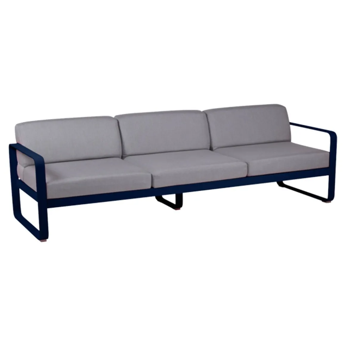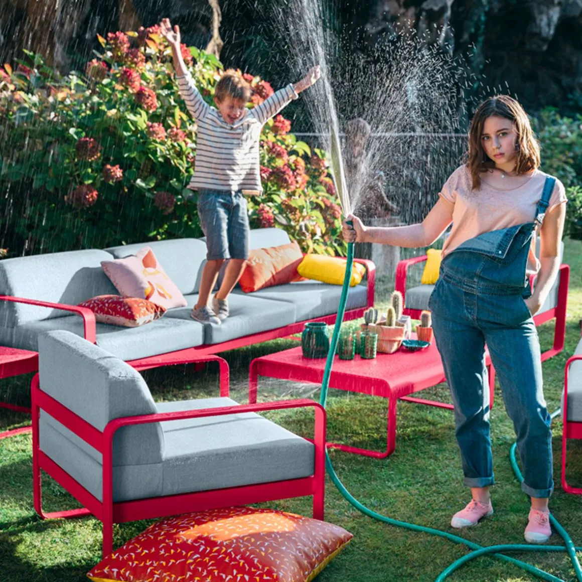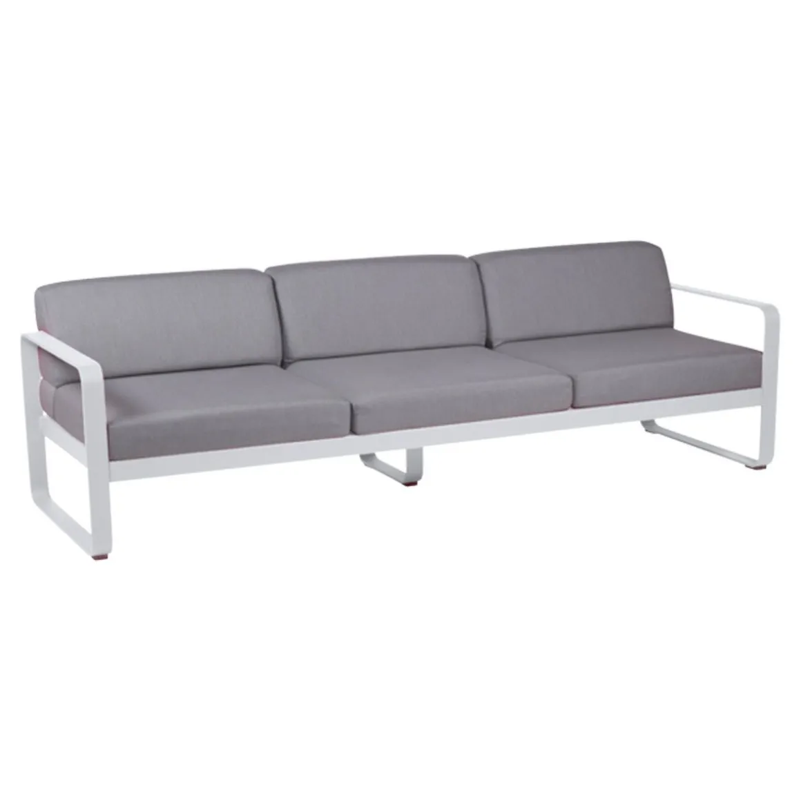 Canapé 3 places Bellevie – gris de Fermob. Le canapé Bellevie 3 places va vous faire craquer ! Son confort vous transporte loin, même si ce ne sont pas encore les vacances… Votre esprit s’évade sur votre playlist préférée… Détente et farniente sont au rendez-vous. Vous êtes bien, vous savourez ce moment ! Ce canapé d’extérieur en aluminium, aux dimensions généreuses, s’avère idéal pour tous les âges et tous les gabarits. Il vous accueille, vous + votre conjoint + vos 2 enfants, vous + vos meilleurs amis et votre chien… Complétez la liste des possibilités : la composition des combinaisons est infinie ! Trois personnes peuvent être confortablement installées côte à côte et… jusqu’à 6 personnes (un peu) plus serrées ! Le canapé Bellevie a la douceur et l’allure d’un canapé de salon grâce à la douceur et la qualité du tissu Sunbrella 100% outdoor développé en exclusivité pour Fermob par Dickson, leader mondial du textile d’extérieur. À ce toucher velouté s’ajoutent de véritables performances techniques : déperlance, résistance aux UV, aux taches, aux moisissures…