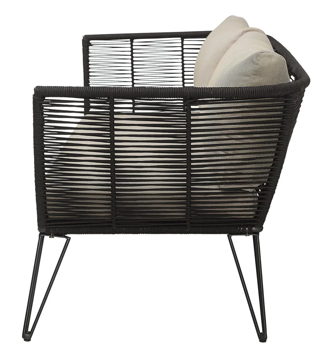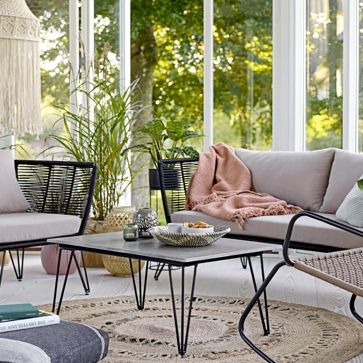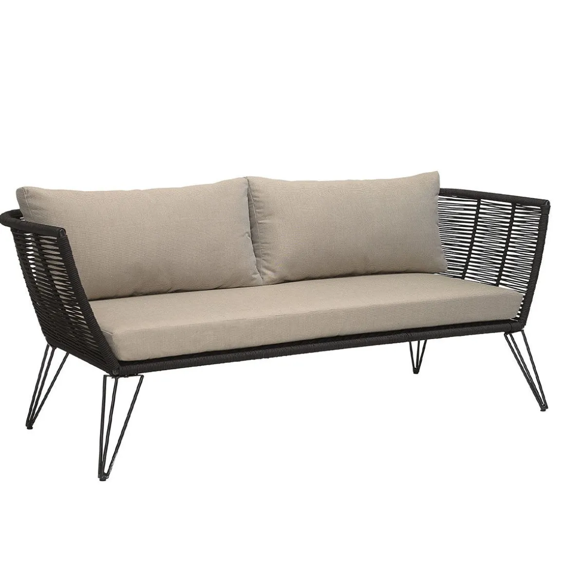 Sur le fil… Le canapé Mundo apportera une adorable touche rétro à votre terrasse ou jardin. Inspiré du ‘’mobilier scoubidou’’ des années 50, ce canapé extérieur Bloomingville se compose de fils en PVC, tressés sur une fine armature en métal laqué. Ce cordage en plastique est résistant aux intempéries et aux rayons UV. La matière ajourée apporte une grande légèreté visuelle. Les coussins confortables sont recouverts de tissu polyester imperméable, adapté à une utilisation à l’extérieur. Très fifties, le piètement anguleux en fil d’acier est aérien et graphique.