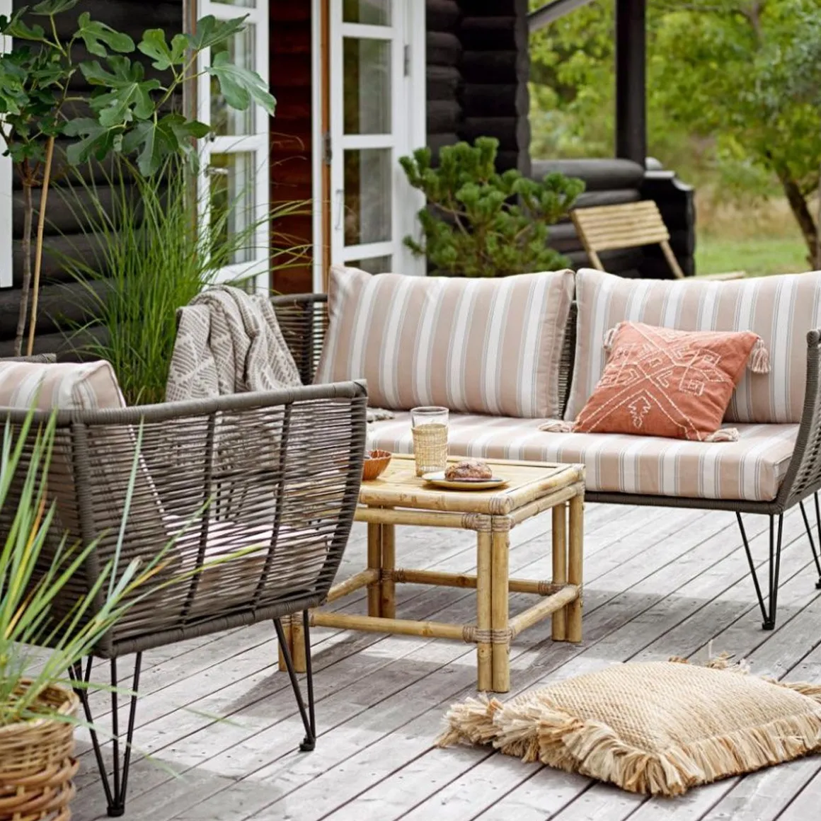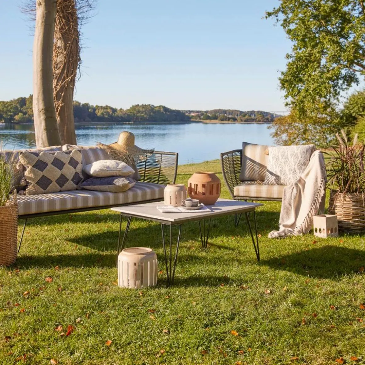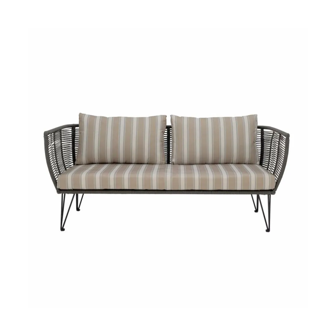 Sur le fil… Le canapé Mundo apportera une adorable touche rétro à votre terrasse ou jardin. Inspiré du ‘’mobilier scoubidou’’ des années 50, ce canapé extérieur Bloomingville se compose de fils en PVC, tressés sur une fine armature en métal laqué. Ce cordage en plastique est résistant aux intempéries et aux rayons UV. La matière ajourée apporte une grande légèreté visuelle. Les coussins confortables sont recouverts de tissu polyester imperméable, adapté à une utilisation à l’extérieur. Très fifties, le piètement anguleux en fil d’acier est aérien et graphique.