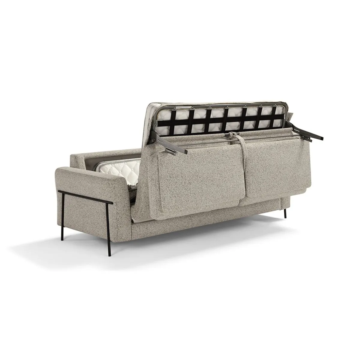 Canapé convertible avec sommier électro-soudé, système d’assise avec sangles élastiques, pied h13, matelas h 14 OS 30 et mécanisme sans range-oreiller. L’ouverture se fait d’un seul mouvement et il n’est pas nécessaire de démonter les pièces et/ou la tapisserie pour passer de la position canapé à la position lit.