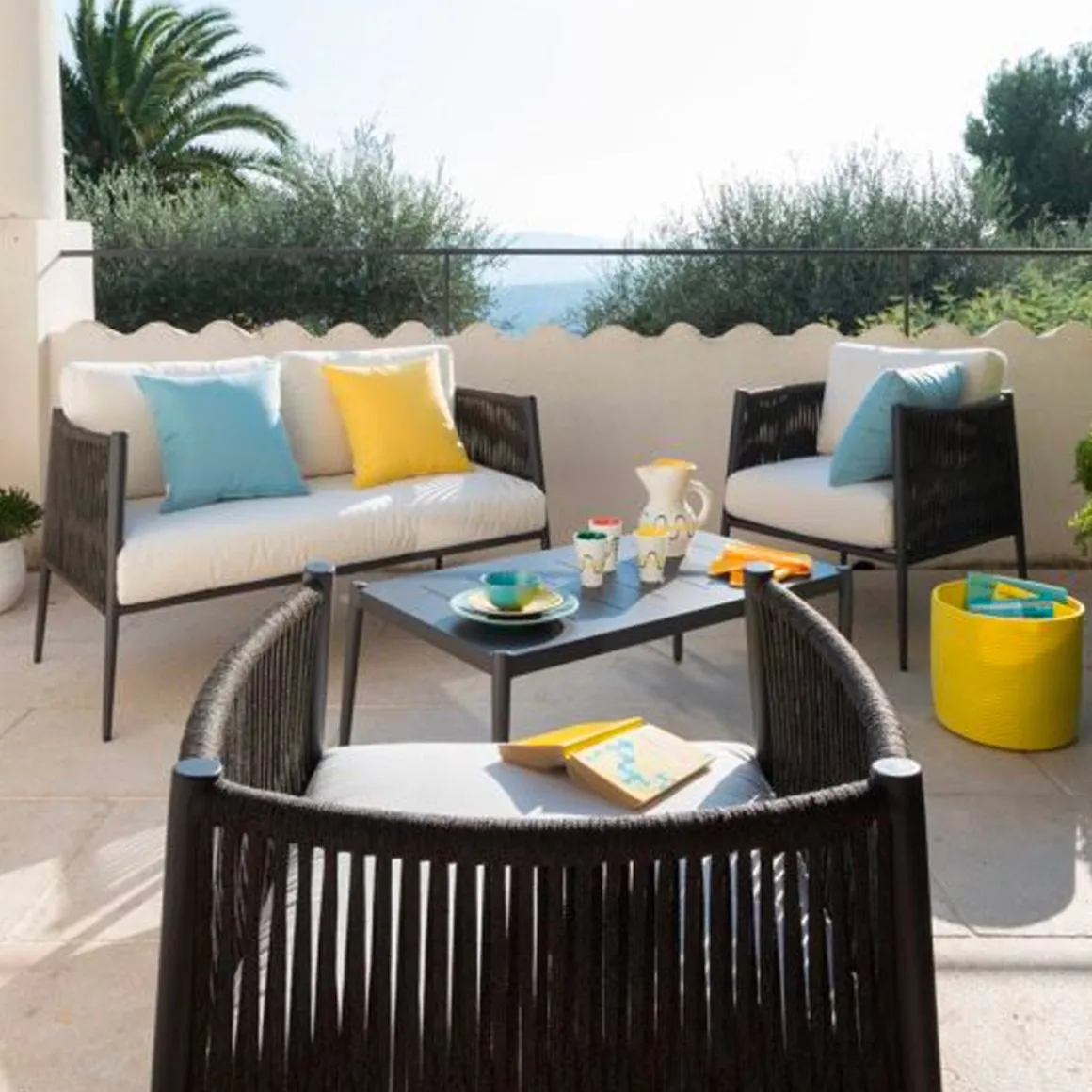 Matériaux : Aluminium tubulaire, corde en polyoléfine, coussins 100% acrylique