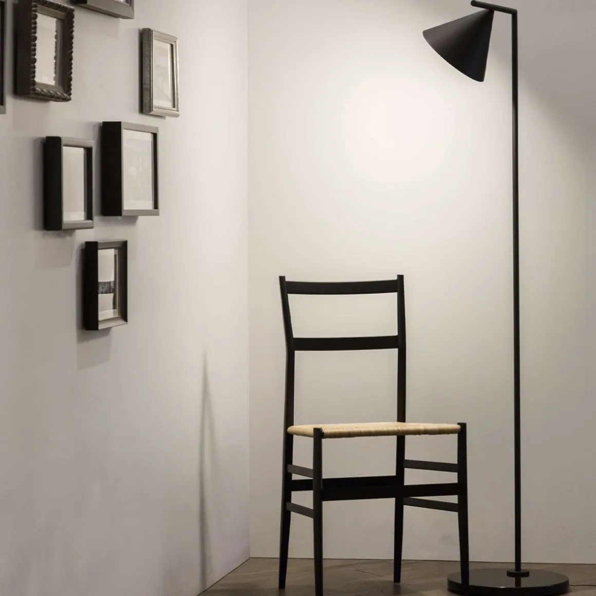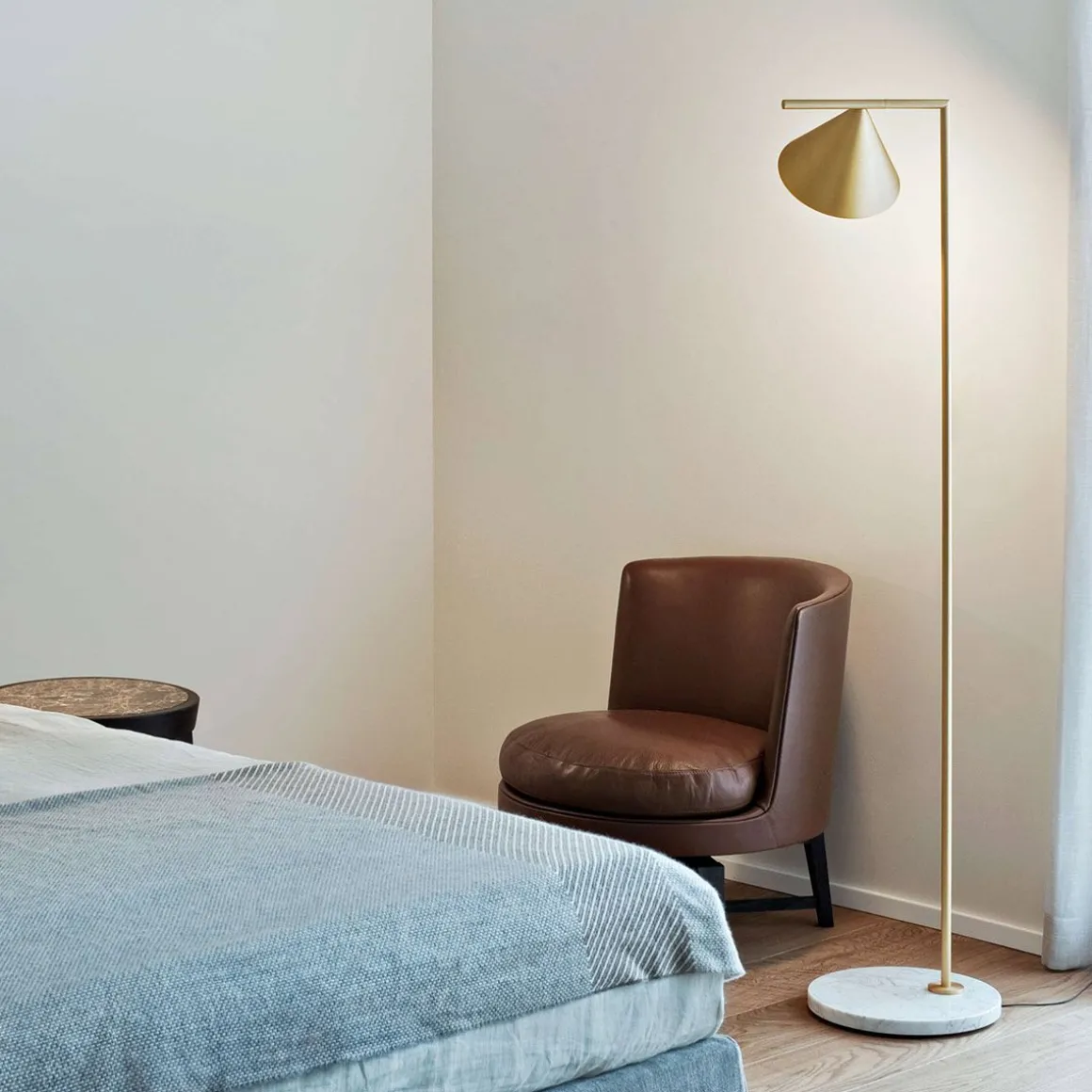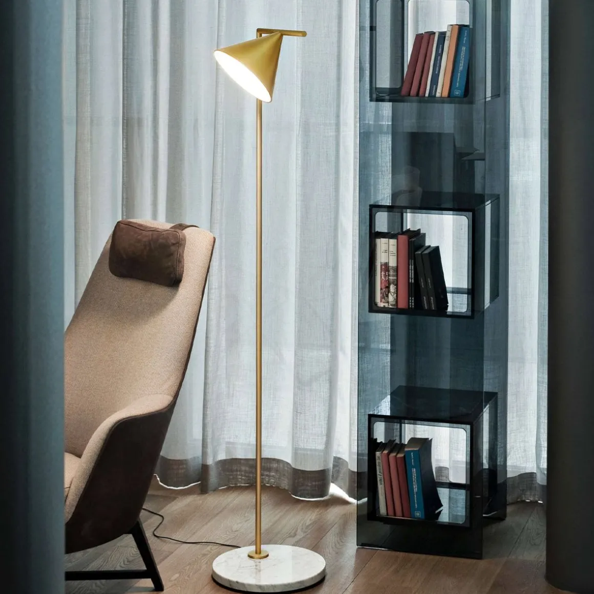 « Je voulais dessiner une lampe à double fonction : un lampadaire qui éclaire l’espace en diffusant assez de lumière et qui devienne compagnon de lecture par une simple rotation. Une idée d’équilibre, avec un cône délicatement posé sur une tige orientable.” – M. Anastassiades