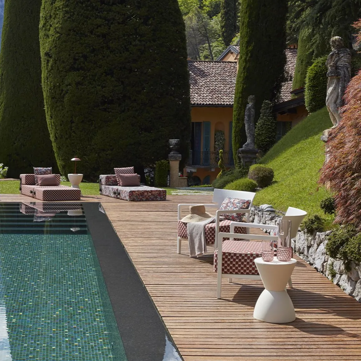 Le canapé Plastics, le pouf Trix de Piero Lissoni et le fauteuil Cara de Philippe Starck se présentent sous un nouveau jour avec des tissus Liberty spécialement étudiés pour les espaces extérieurs. Ces tissus confèrent une nouvelle dimension esthétique et fonctionnelle aux produits, en garantissant un bon niveau de résistance et de durabilité, même dans les environnements extérieurs. Avec deux motifs géométriques et un motif floral, cette collection de meubles d’extérieur offre un mélange unique de style et de confort, pour profiter de l’été avec élégance et sous le signe de la détente. Chaque pièce, du canapé au pouf en passant par le fauteuil, devient ainsi un bel élément pour meubler les espaces extérieurs avec goût et raffinement, tout en offrant une agréable expérience de détente en plein air. Disponible dans les palettes de couleurs vert sauge, rouille, beige, jaune et bleu.