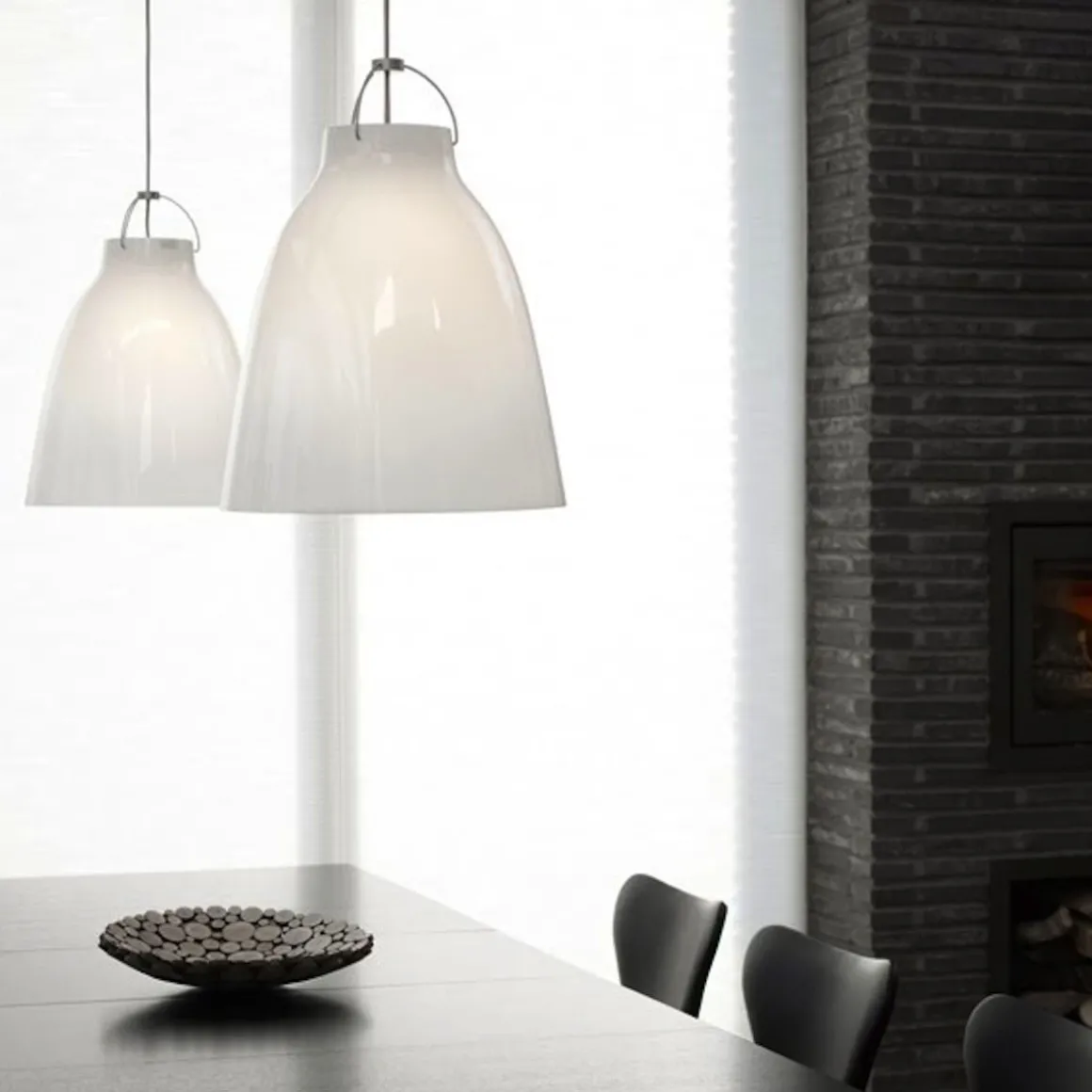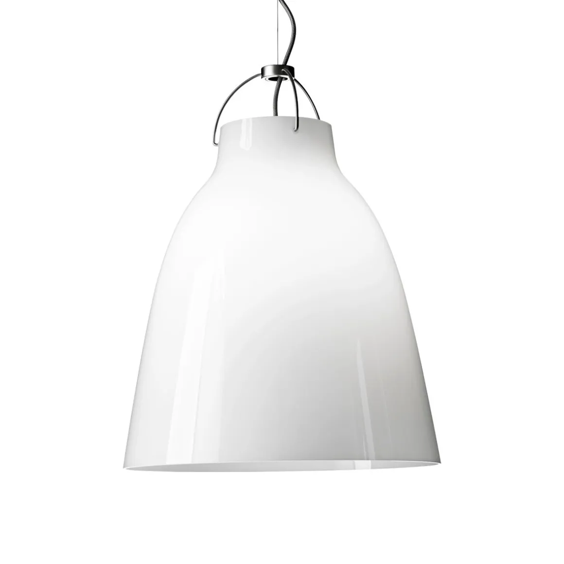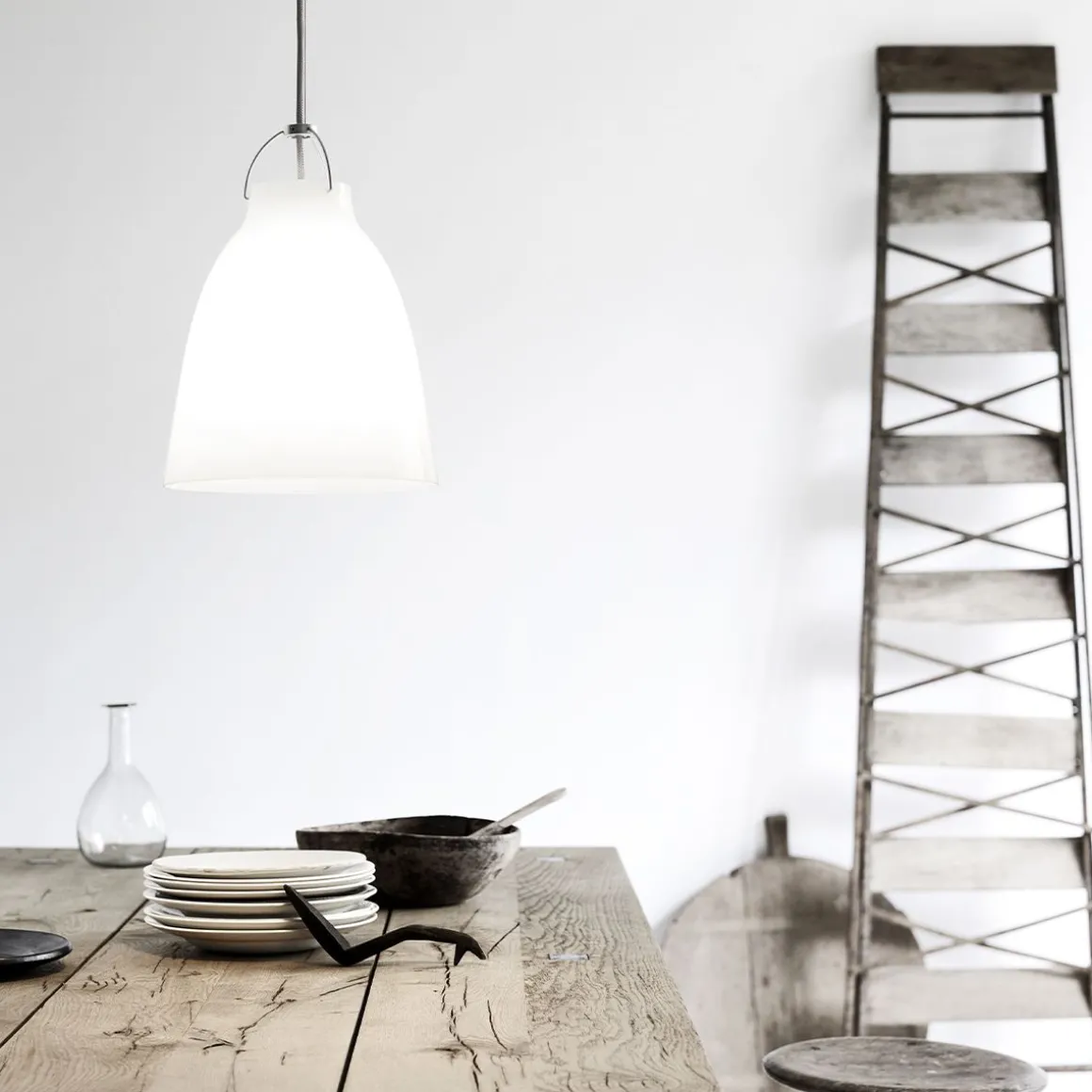 La suspension Caravaggio est désormais dans un nouveau matériau : le verre opalin. Caravaggio est connue dans sa version en métal laqué brillant avec une diffusion de la lumière concentré vers le bas. Désormais grâce à l’abat-jour en verre opale, la lumière rayonne dans toutes les directions. La profondeur du diffuseur empêche l’éblouissement, peu importe la hauteur à laquelle est fixée la suspension.
