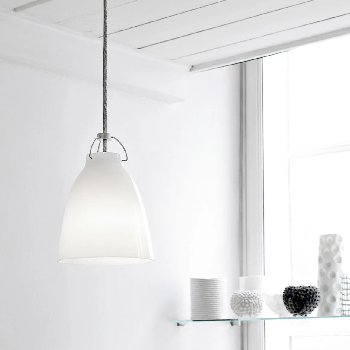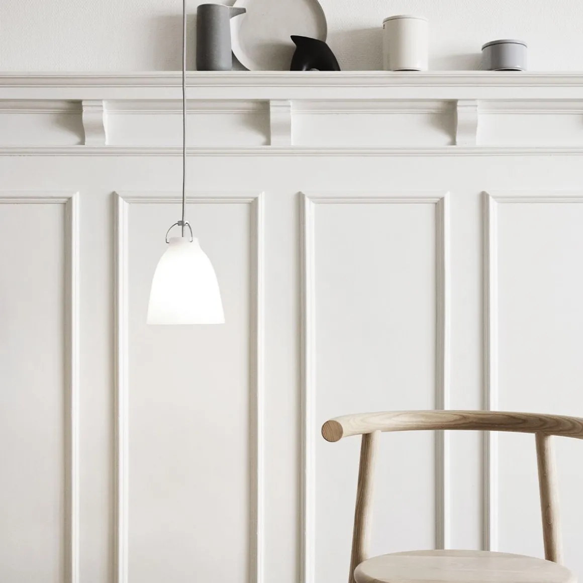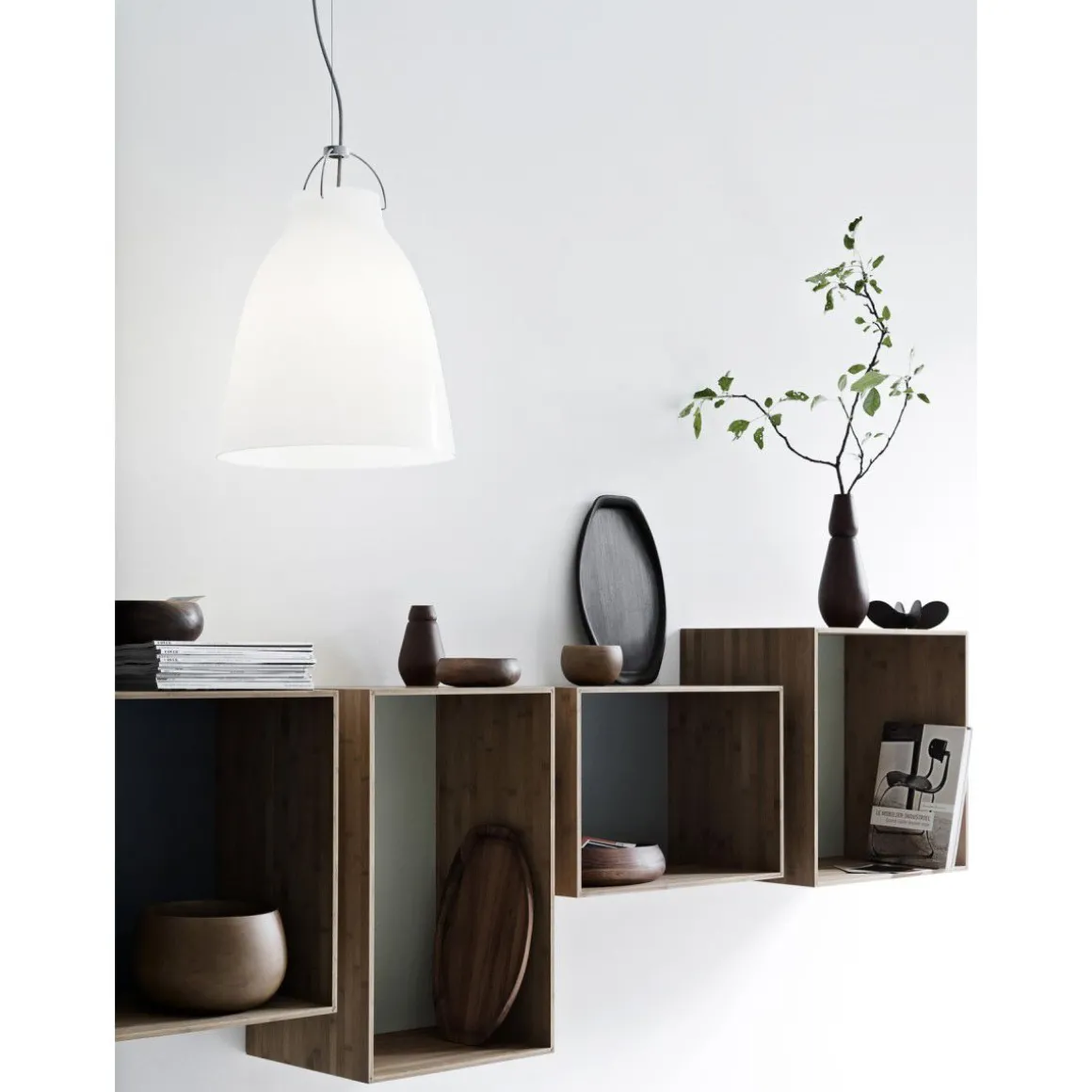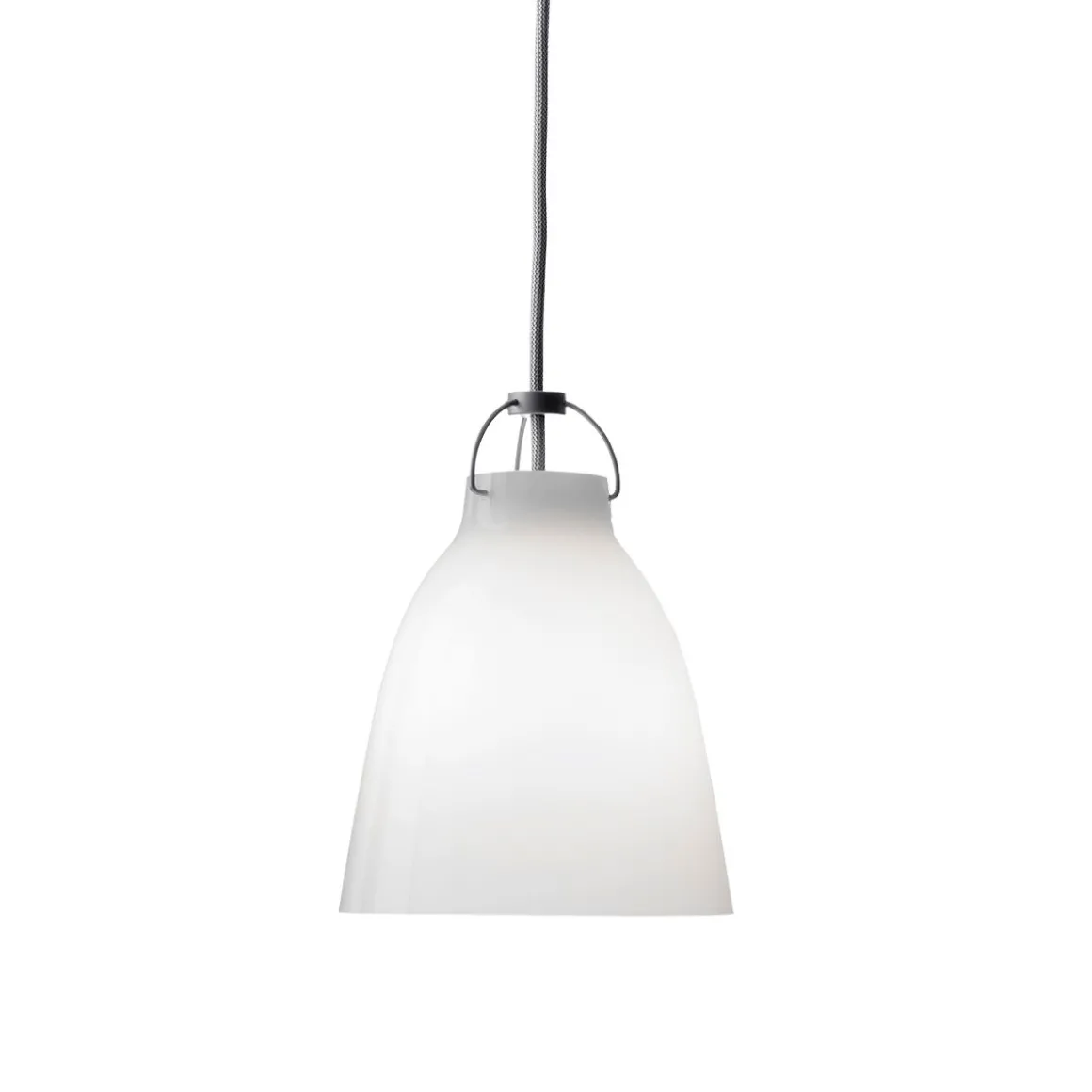 La suspension Caravaggio est désormais dans un nouveau matériau : le verre opalin. Caravaggio est connue dans sa version en métal laqué brillant avec une diffusion de la lumière concentré vers le bas. Désormais grâce à l’abat-jour en verre opale, la lumière rayonne dans toutes les directions. La profondeur du diffuseur empêche l’éblouissement, peu importe la hauteur à laquelle est fixée la suspension.