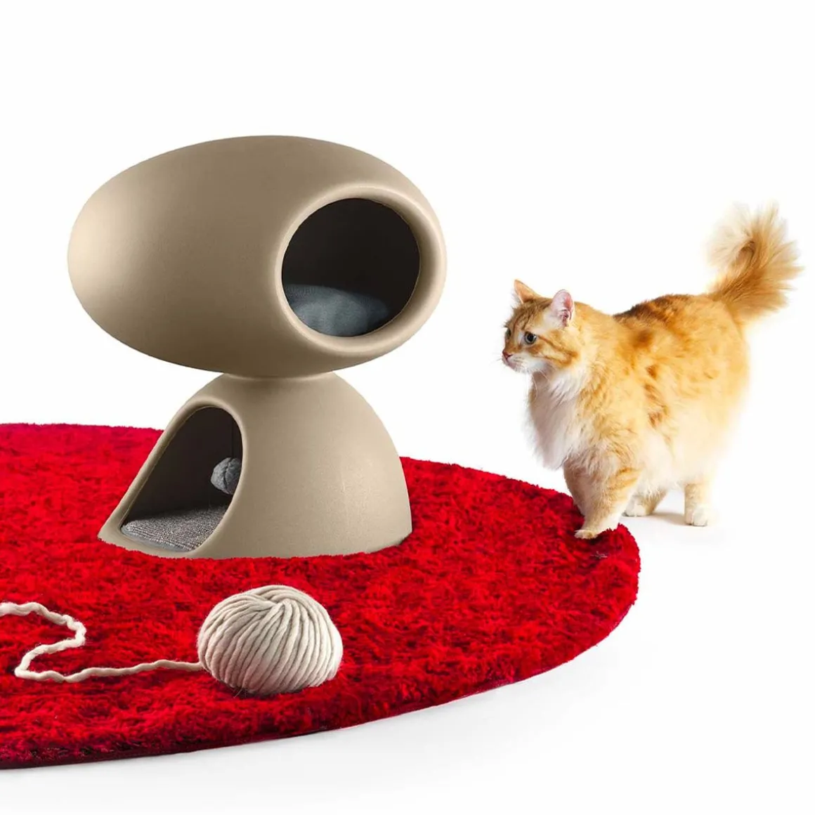 Cat cave de Qeeboo. Cat Cave, conçue par Stefano Giovannoni dans le cadre d’un partenariat entre Qeeboo et United Pets, est une maison-grotte-refuge pour chats. Elle est composée de deux pierres superposées : la grotte du fond est dotée d’un tapis à gratter au sol et d’une boule molle suspendue au plafond. Celui du haut est caractérisé par un hublot qui permet au chat d’entrer, de se protéger et d’examiner le monde extérieur, en planifiant la prochaine attaque domestique.