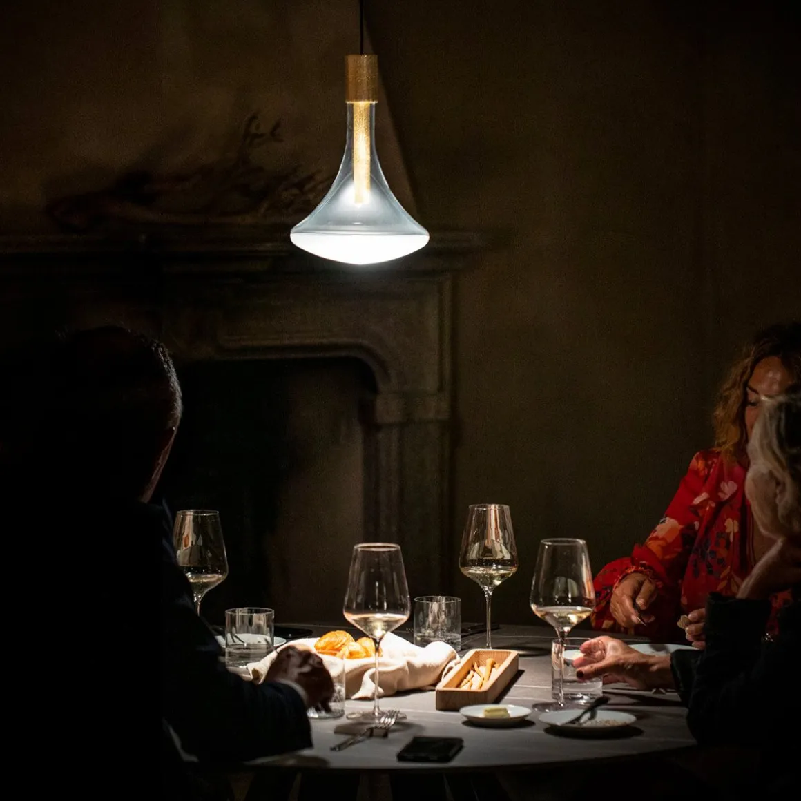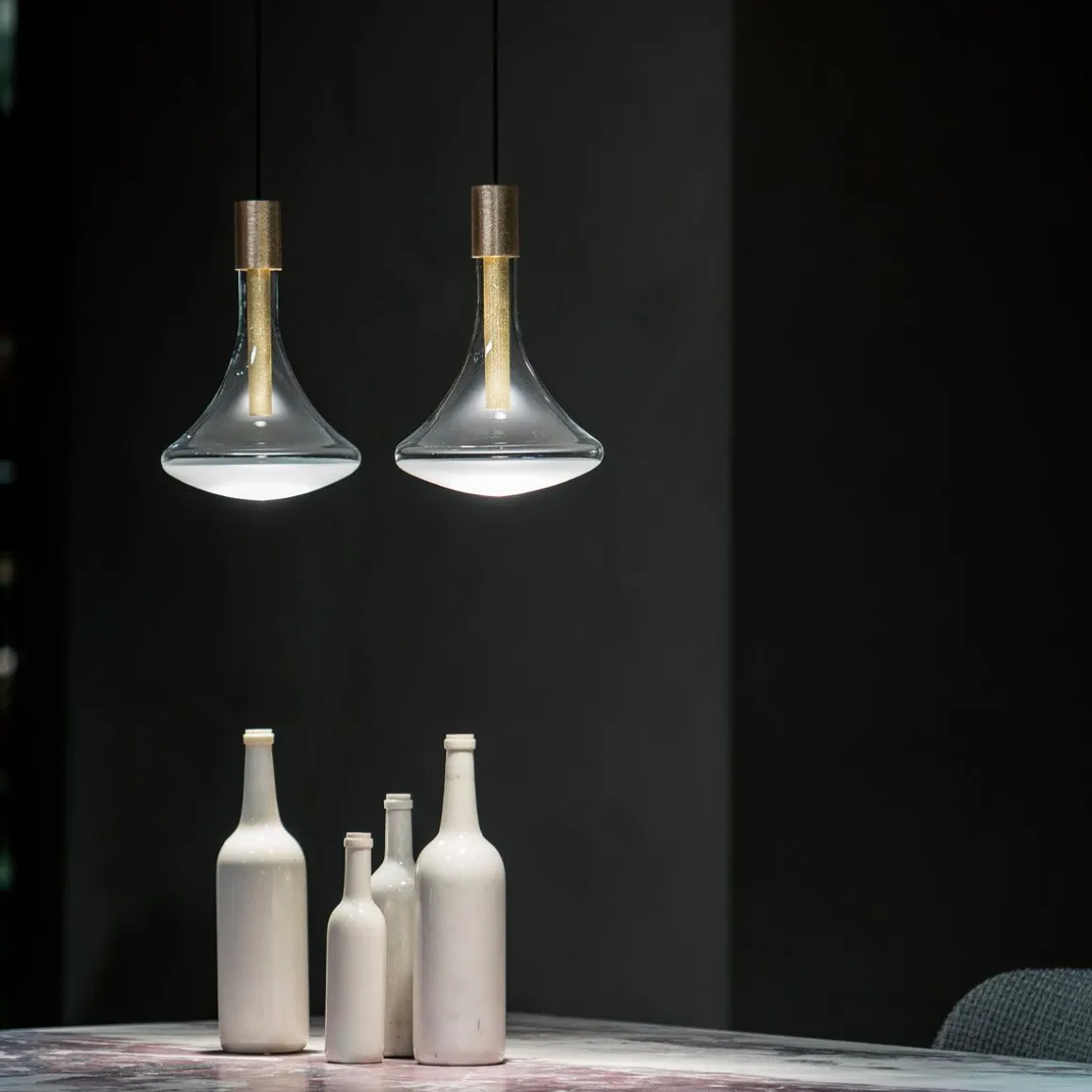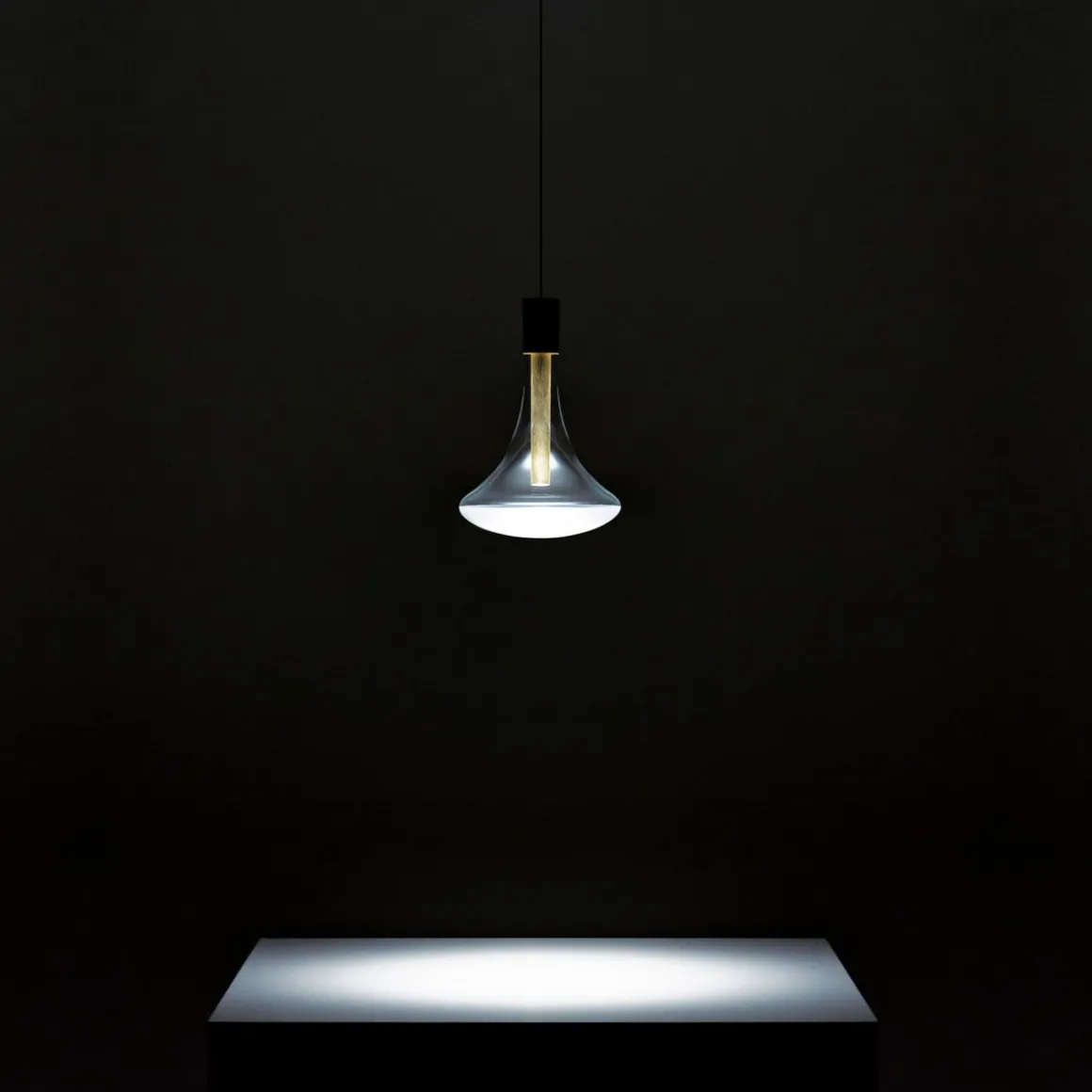 Cathode de Davide Groppi. Une ampoule de verre soufflé bouche et à l’aspect scientifique. La forme évoque celle d’une ampoule jamais née, atmosphères steampunk, situations où les instruments étaient actionnés par les premières formes d’électricité. L’ampoule classique sans futur devient un appareil à diodes lumineuses. Comment aurait été le passé si le futur était arrivé plus tôt ?