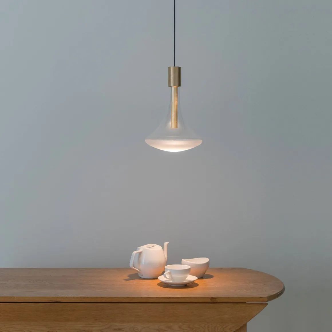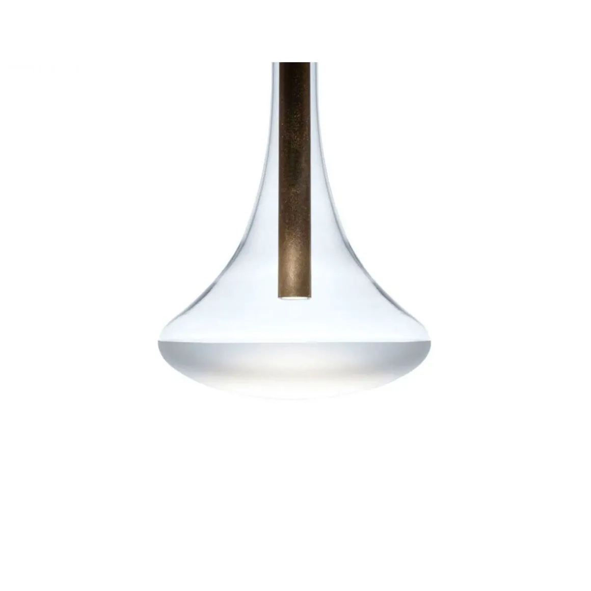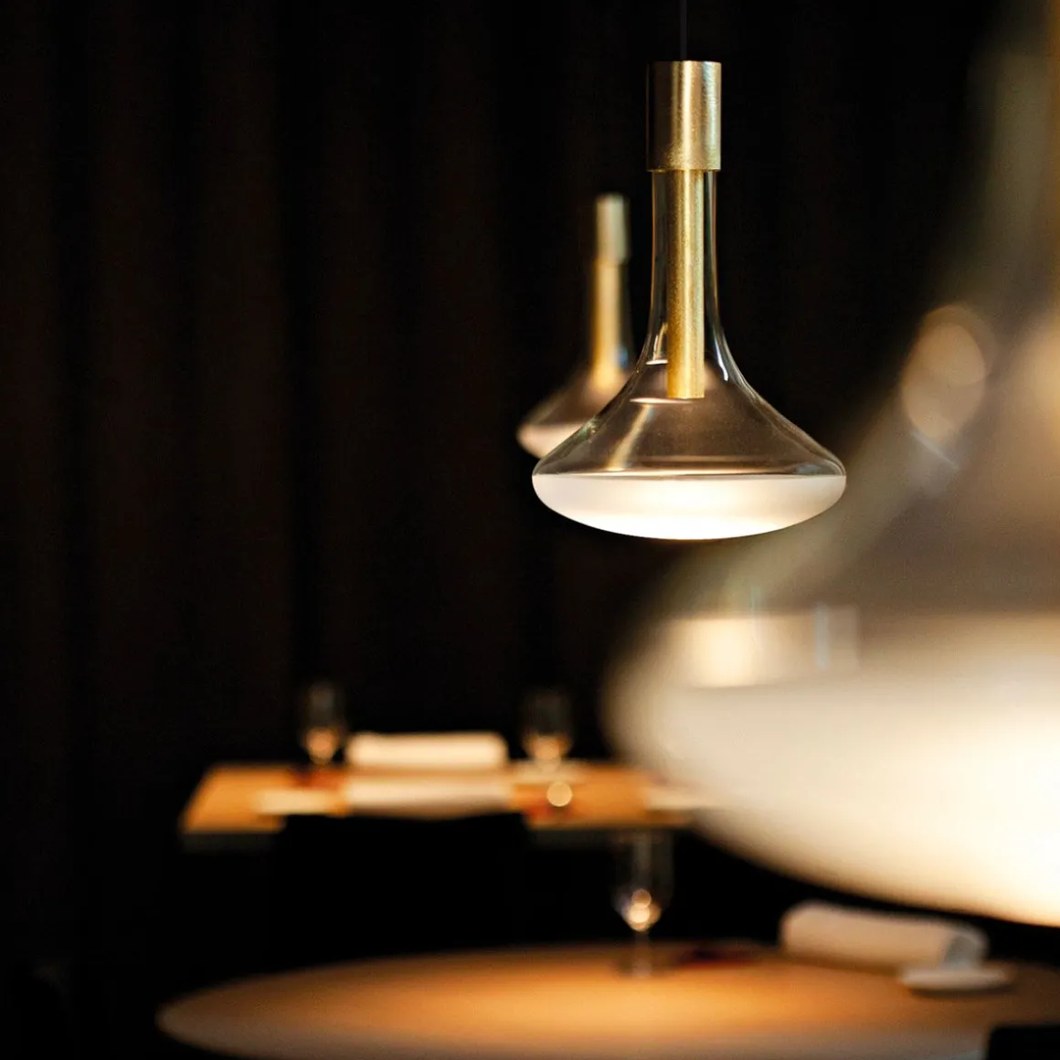 Cathode de Davide Groppi. Une ampoule de verre soufflé bouche et à l’aspect scientifique. La forme évoque celle d’une ampoule jamais née, atmosphères steampunk, situations où les instruments étaient actionnés par les premières formes d’électricité. L’ampoule classique sans futur devient un appareil à diodes lumineuses. Comment aurait été le passé si le futur était arrivé plus tôt ?