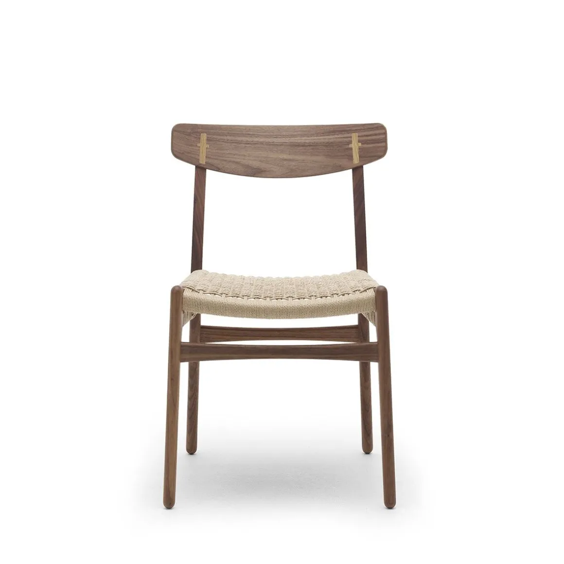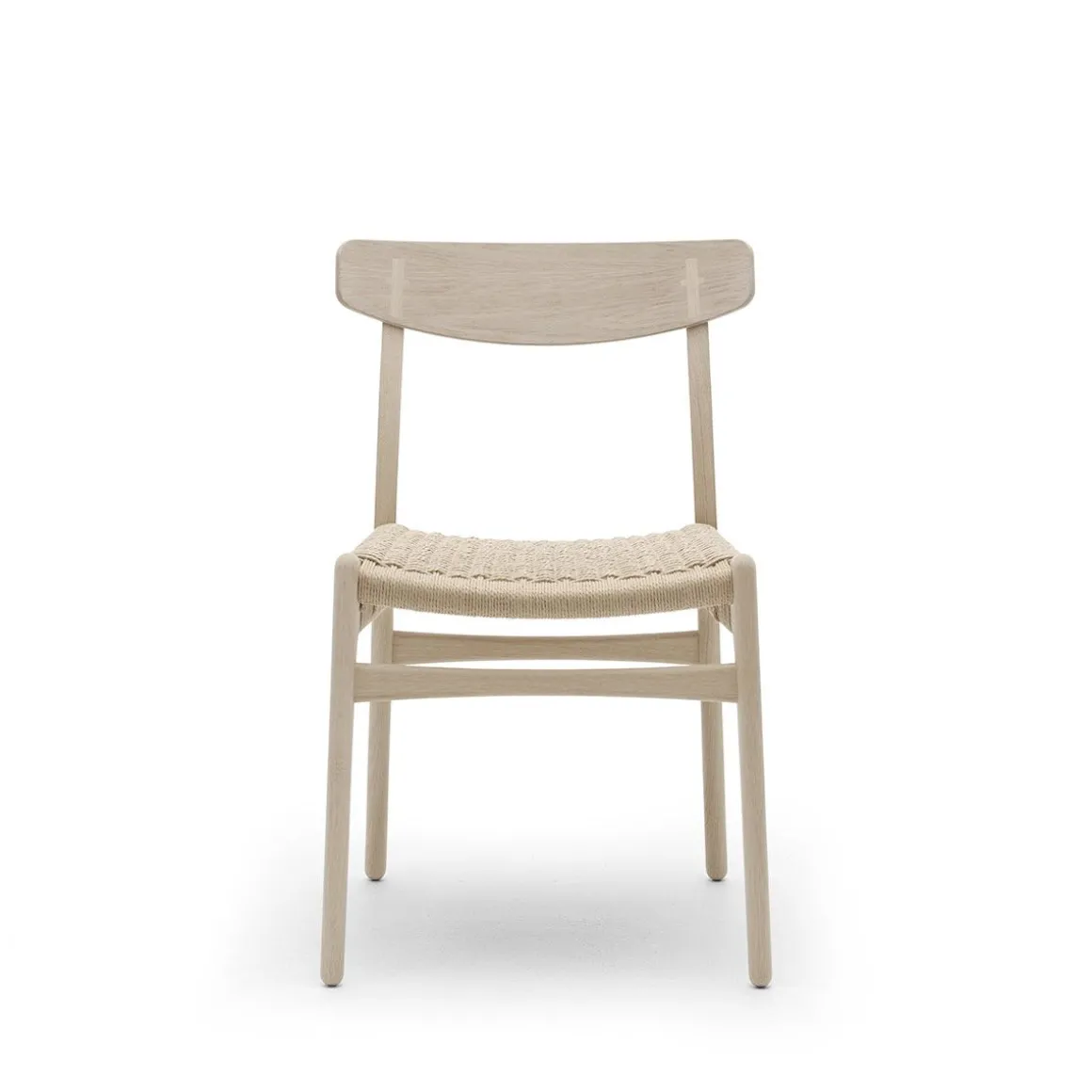 La chaise de salle à manger CH23 a été l’une des premières chaises conçues par Hans J. Wegner pour Carl Hansen & Søn en 1950. Les premiers chefs-d’œuvre qu’il a créés étaient non seulement uniques, mais établissaient également de nouvelles normes pour la conception de meubles modernes avec leur légèreté, leur expression artistique et leur ergonomie. Bien que la chaise CH23 puisse sembler simple à première vue, elle intègre de nombreux détails fins et sophistiqués, parmi lesquels les élégants capuchons cruciformes du dossier, un siège tissé à la main unique et des pieds arrière arqués vers l’arrière qui assurent une stabilité optimale. Carl Hansen & Søn a relancé le CH23 en 2017, fidèle au dessin de travail original de Wegner, faisant à nouveau partie du premier chef-d’œuvre de la collection.