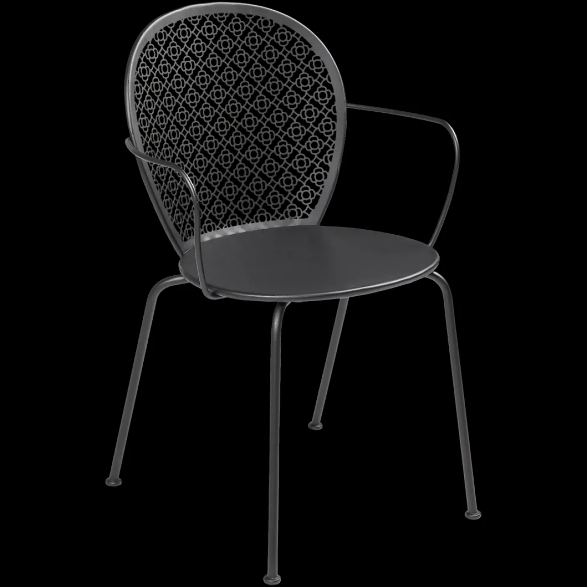 Chaise avec accoudoirs Lorette x2 de Fermob. Dans un esprit maison de campagne, le bridge Lorette saura séduire les citadins en mal de verdure. Le motif ajouré du dossier affirme l’identité de la collection tout en démontrant une fois encore le savoir-faire de Fermob sur le travail du métal. La découpe laser et les perforations du motif sont d’une extrême finesse. Le motif est délicat mais la robustesse est là !