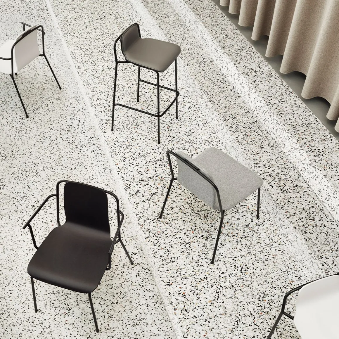 Il y a quelque chose de pratiquement graphique dans la façon dont le cadre en acier mince se développe sous le siège et le dossier de la chaise Studio, encadrant la coque moulée dans un design aéré. Les lignes fluides se détachent dans une silhouette accrocheuse, comme un dessin au trait ou un pictogramme, tout comme les espaces vides entre le cadre et le dos agissent pour définir la forme. La construction simple en placage et tube d’acier oriente les pensées vers les anciennes chaises d’usine françaises, donnant à Studio ses notes industrielles. Un design qui attire l’attention, mais rayonne de pure simplicité. La série polyvalente de chaises Studio est conçue pour une utilisation dans les espaces domestiques et publics. La série comprend des chaises, des fauteuils et des tabourets de bar en deux hauteurs. Tous les modèles sont empilables, ce qui rend la gamme adaptée aux restaurants et aux établissements d’enseignement nécessitant des zones transformables. Le cadre en acier permet de saisir facilement les chaises et de les déplacer selon les besoins.
