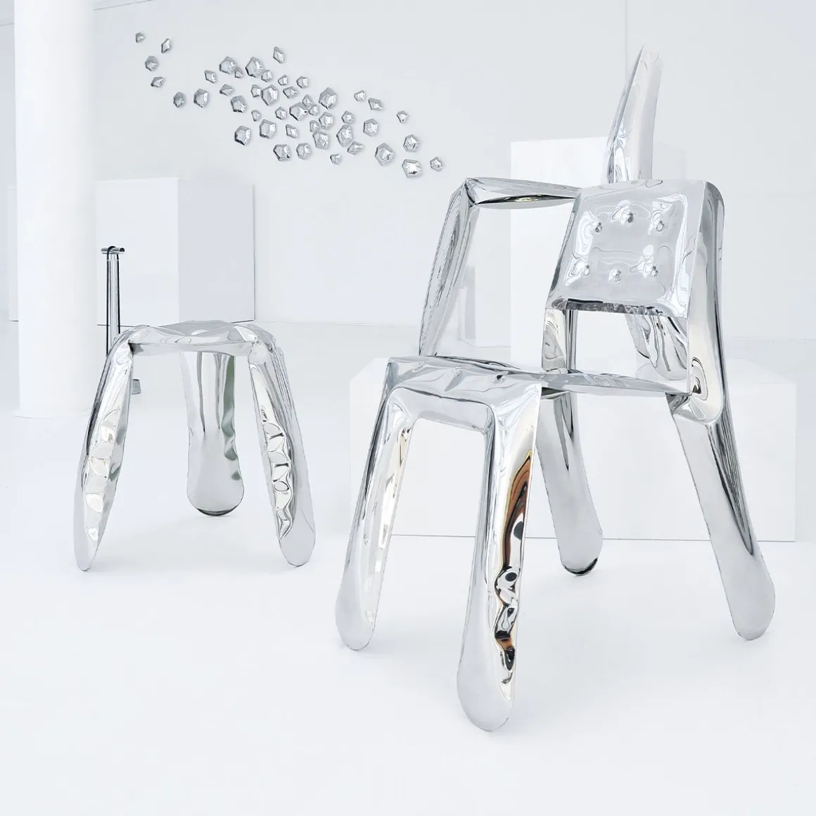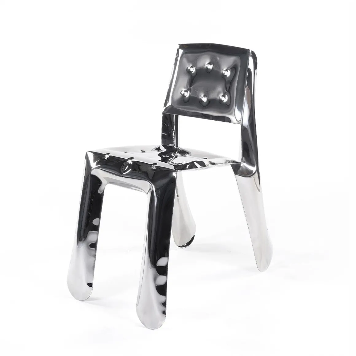 Chippensteel 0.5 est un bel exemple de mélange de processus FiDU et de savoir-faire. La forme 2D est découpée dans une tôle et passe par le soudage et le gonflage, devenant une chaise fonctionnelle en trois dimensions. La touche finale du designer et de l’artisan lui donne une beauté finale. La dernière forme optimale de Chippensteel 0.5 est issue de nombreuses expériences, prototypes et processus de conception.
