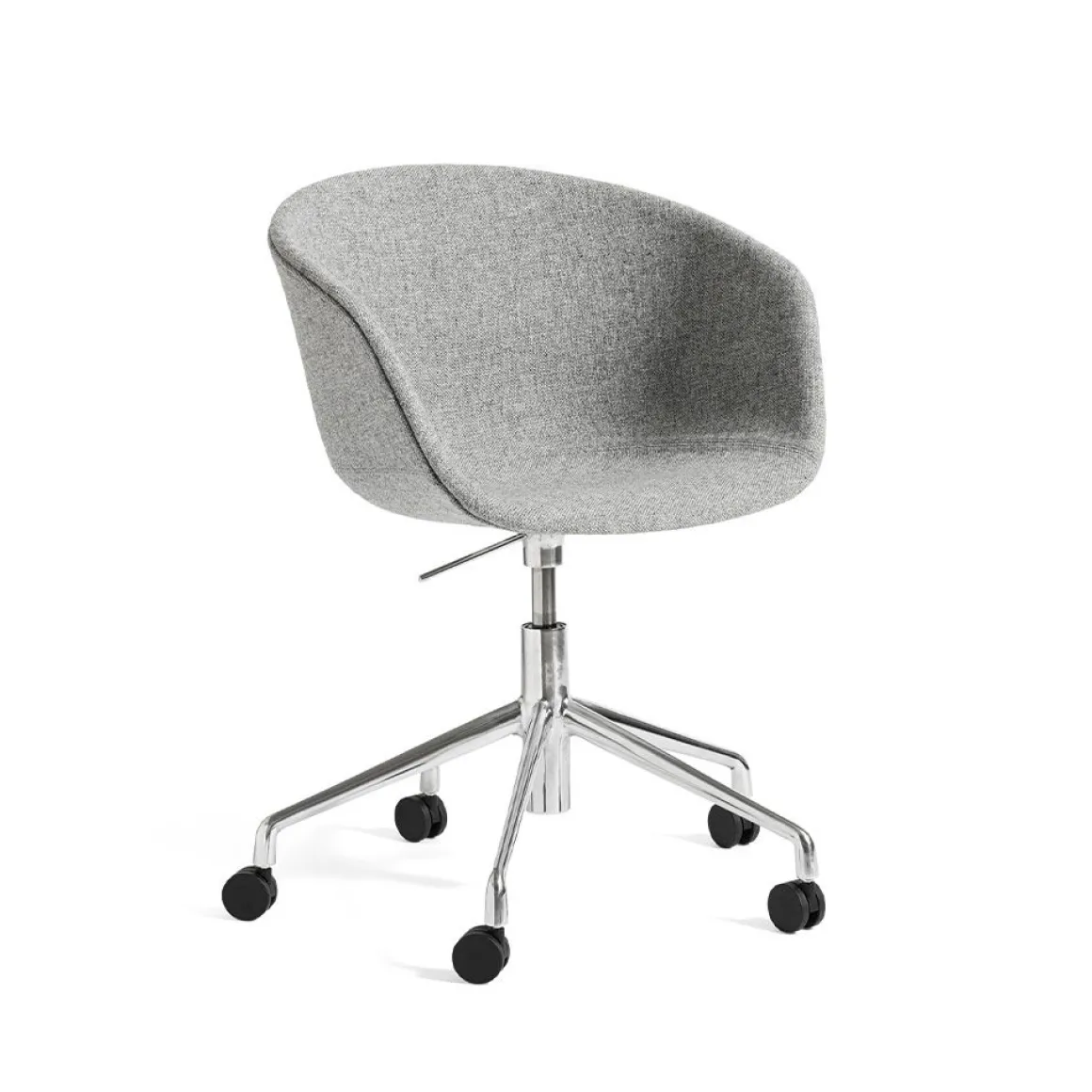 Chaise de Bureau AAC 53 de Hay. La douceur et la chaleur de la coque matelassée modifient le poids exécutif de la chaise AAC Soft 53, apportant une expression accueillante au genre autrement fonctionnel et technique des chaises de bureau. Conservant la même coque incurvée et la même silhouette unifiée qui caractérisent toute la série, la conception comprend une base à roulettes à cinq pieds avec un vérin à gaz qui peut régler la hauteur du siège sur une plage de 14 cm. La base est disponible en aluminium poli ou enduit de poudre, et la coque est proposée dans une variété d’options de rembourrage, offrant une multitude de combinaisons de design qui confèrent à la chaise une polyvalence dans un large éventail de contextes d’entreprise, publics et privés.