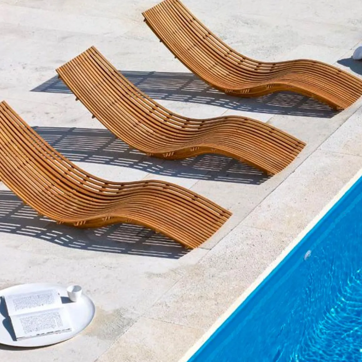 Les lattes en teck cintré confèrent à la chaise longue, à la table et au tabouret Swing un aspect ondoyant qui rappelle les ambiances orientales. Equilibre parfait entre design et ergonomie pour Swing, la chaise longue “à bascule” dont la structure ondulée permet d’en contrôler l’oscillation. Réalisée en lattes de teck galbées à chaud et visserie mise à nu en acier inox, Swing est muni d’un coussin appui-tête en 100% acrylique TEMPOTEST ®blanc écru.