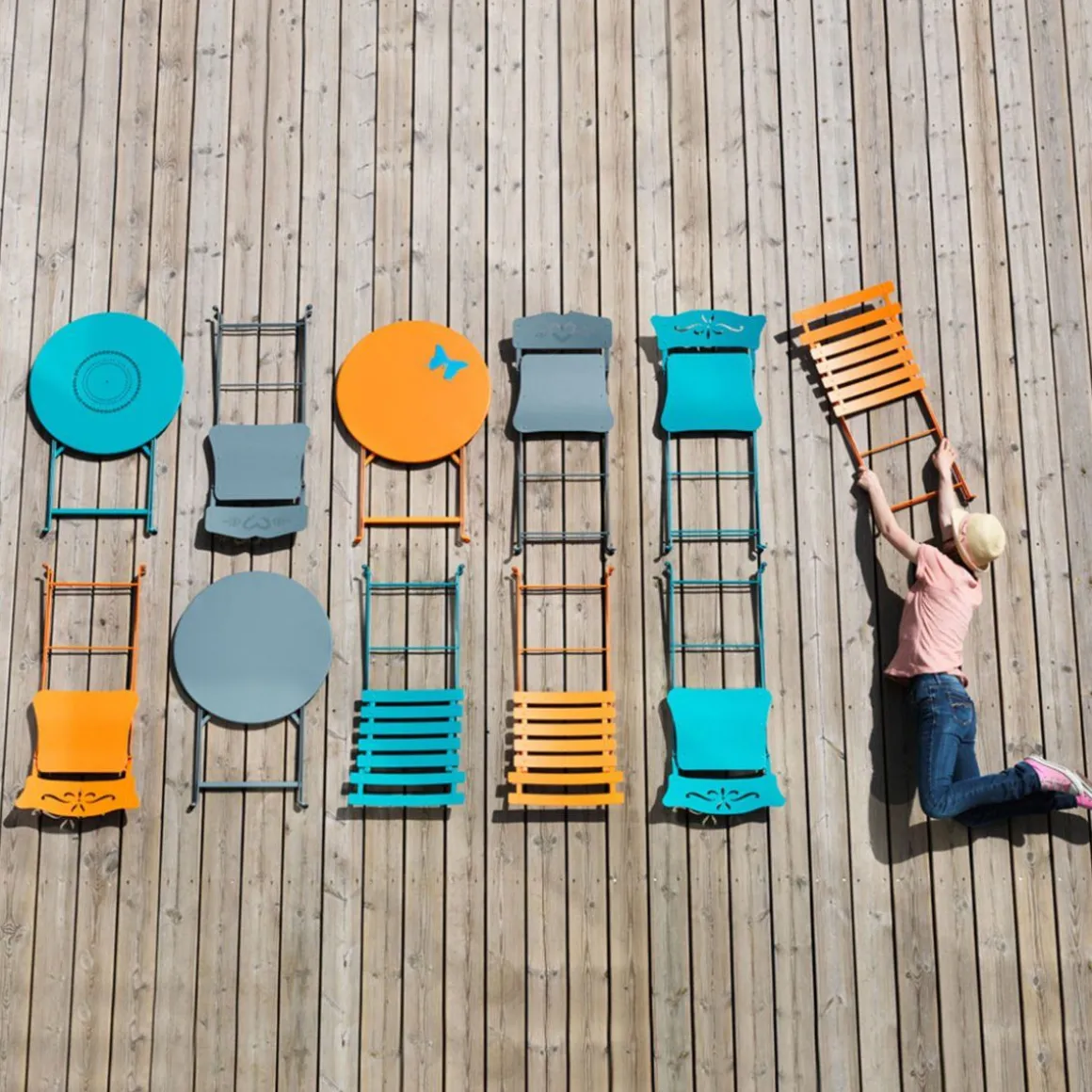 Chaise métal Bistro de Fermob. La collection Bistro crée en 1889 ne cesse de séduir avec son mobilier intemporel. Le mobilier pliant, robuste, léger et facile à transporter trouve sa place sur les terasses de café, dans un coin de lecture ou encore dans votre jardin. Cette collection pleine de simplicité vous est proposée dans de nombreux coloris acidulés apportant la gaité ou que vous soyez. Adaptée pour l’intérieur et l’extérieur, elle deviendra rapidemment indispensable à votre quotidien. Son design minimaliste plaît aux tout petits autant qu’aux grands. Cette chaise pliante est proposée dans une multitude de couleurs qui offrent autant de possibilités de créer son propre décor. Compacte, elle est idéale dans les espaces exigus.