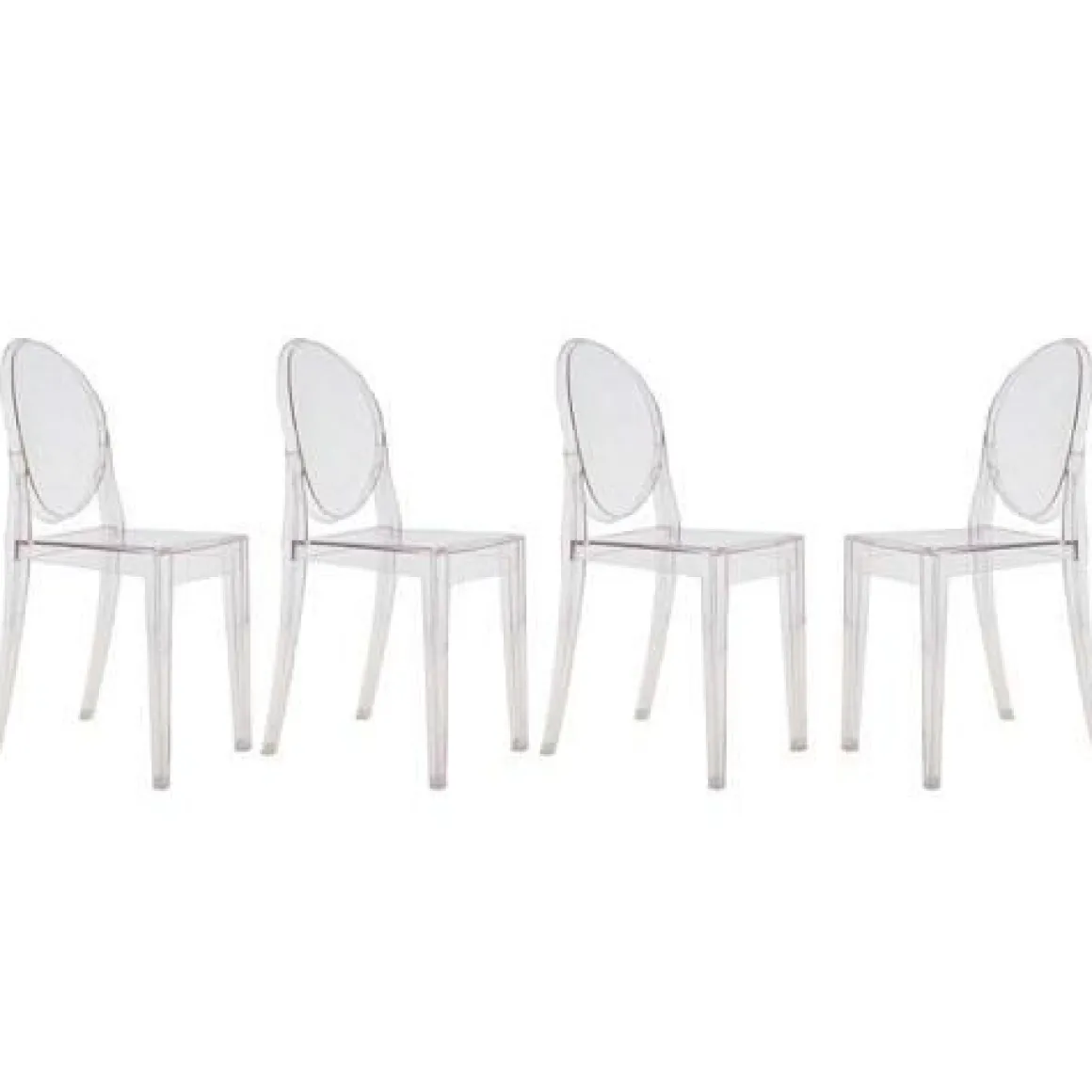 Lot de 4 chaises Victoria Ghost de Kartell & Starck. Une chaise design née de lignes classiques, le dossier arrondi rappelle la forme des médaillons anciens, tandis que le siège est linéaire et géométrique. Victoria Ghost est réalisée en polycarbonate transparent ou coloré en un moule unique à injection. Stable et confortable, elle ne craint ni les griffures ni les chocs, et résiste aux agents atmosphériques. Ce mobilier design a été réalisé grâce au savoir-faire technologique que Kartell a développé au fil des ans, créant des objets qui l’ont rendue célèbre dans le monde entier. Un modèle irresistible qui s’imposera avec élégance quelque soit le type d’ameublement.