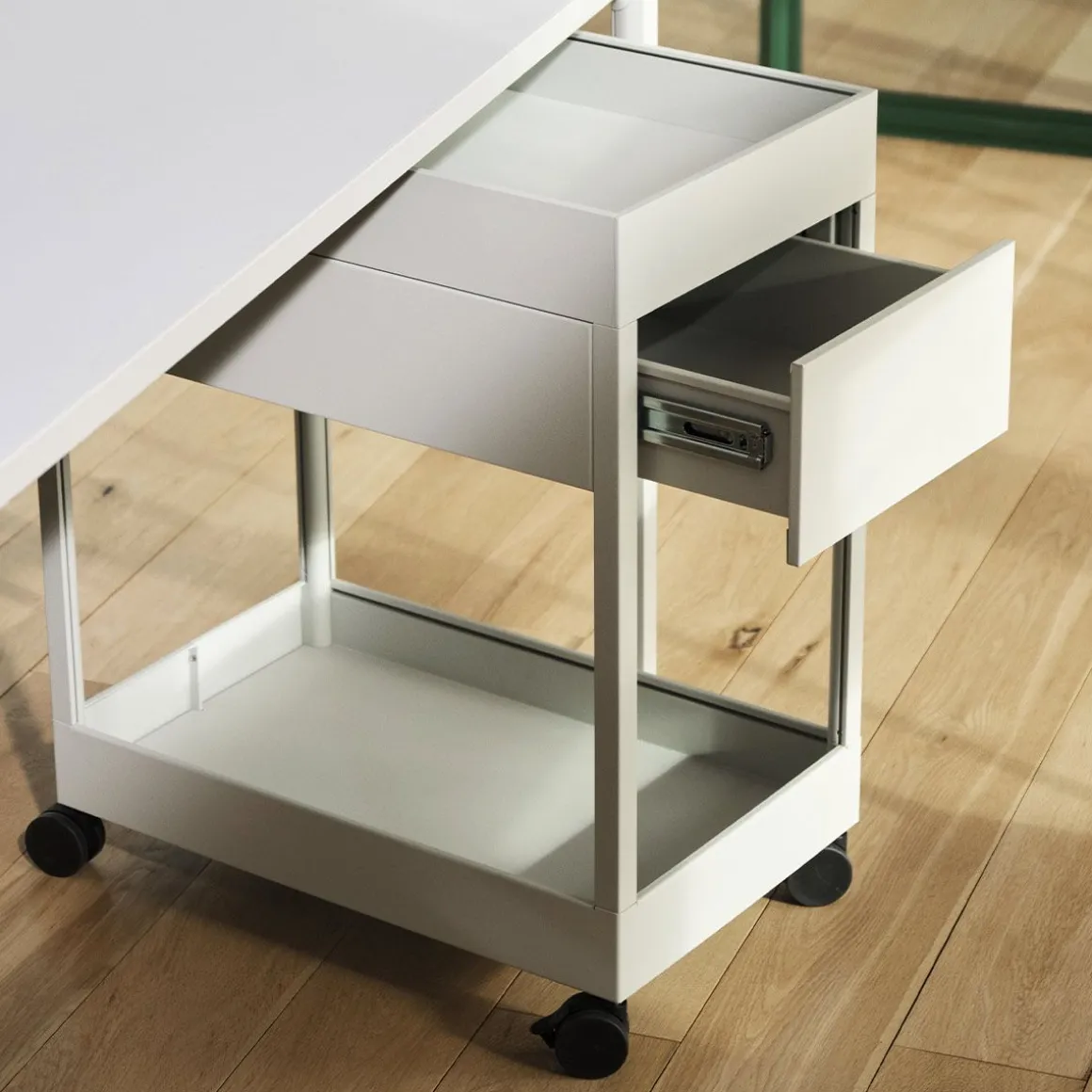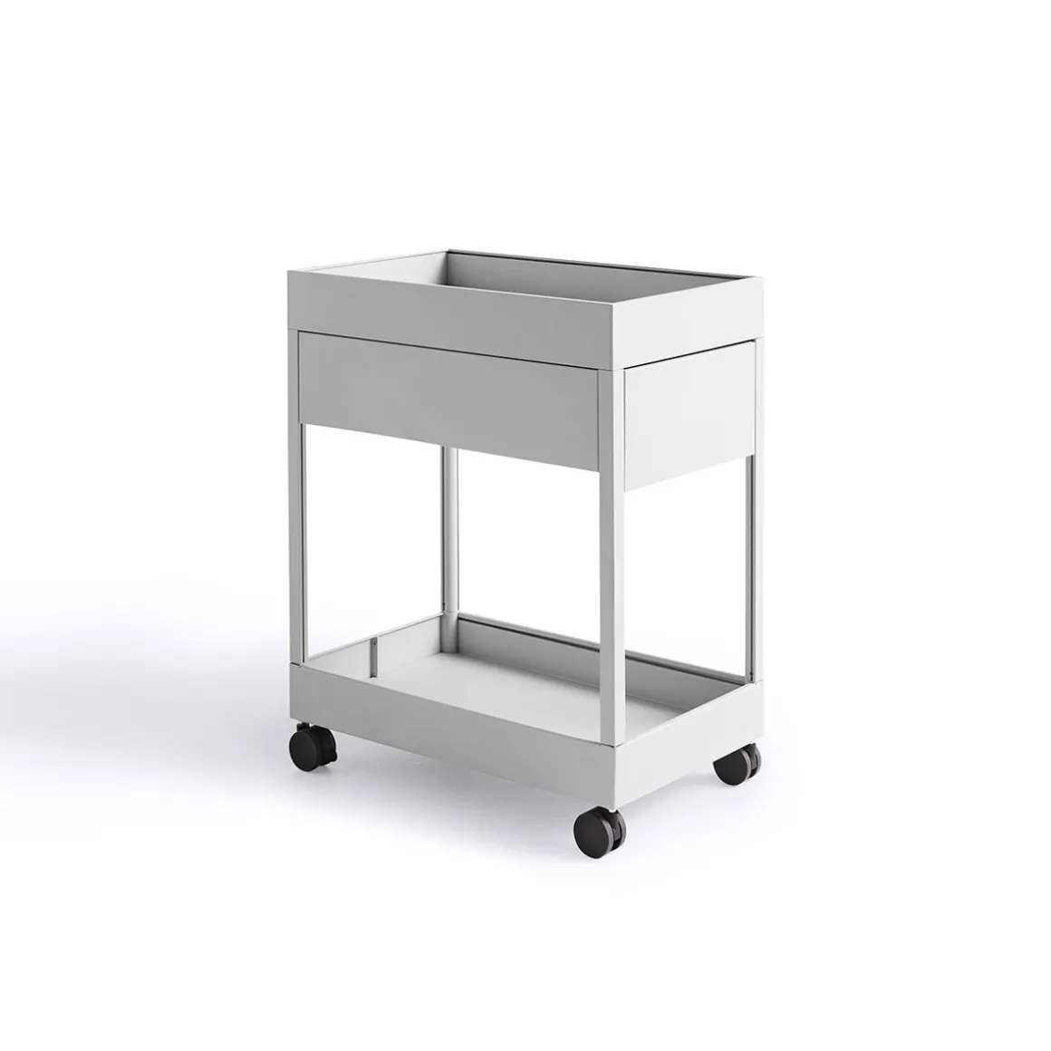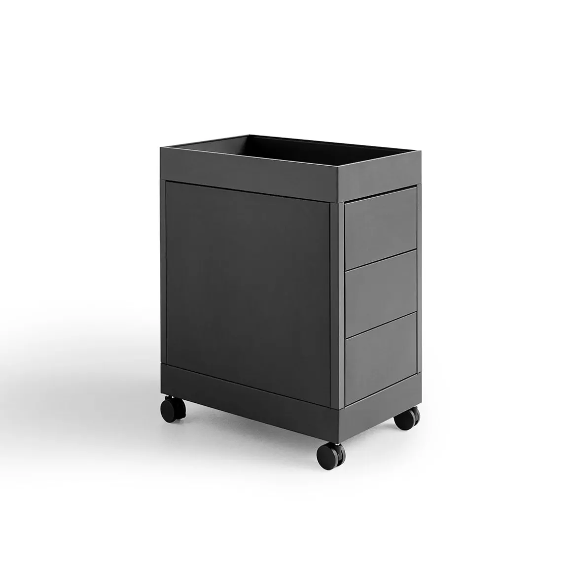 CHARIOT New Order de Hay. Les chariots mobiles New Order sont dotés d’un plateau supérieur et sont livrés avec un seul tiroir et une étagère ouverte en dessous, ainsi qu’une unité fermée avec trois tiroirs. Les deux modèles sont compatibles avec les accessoires de plateau New Order et sont équipés d’un système de verrouillage.
