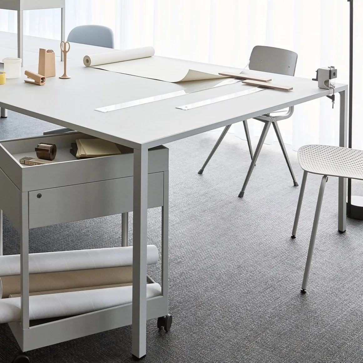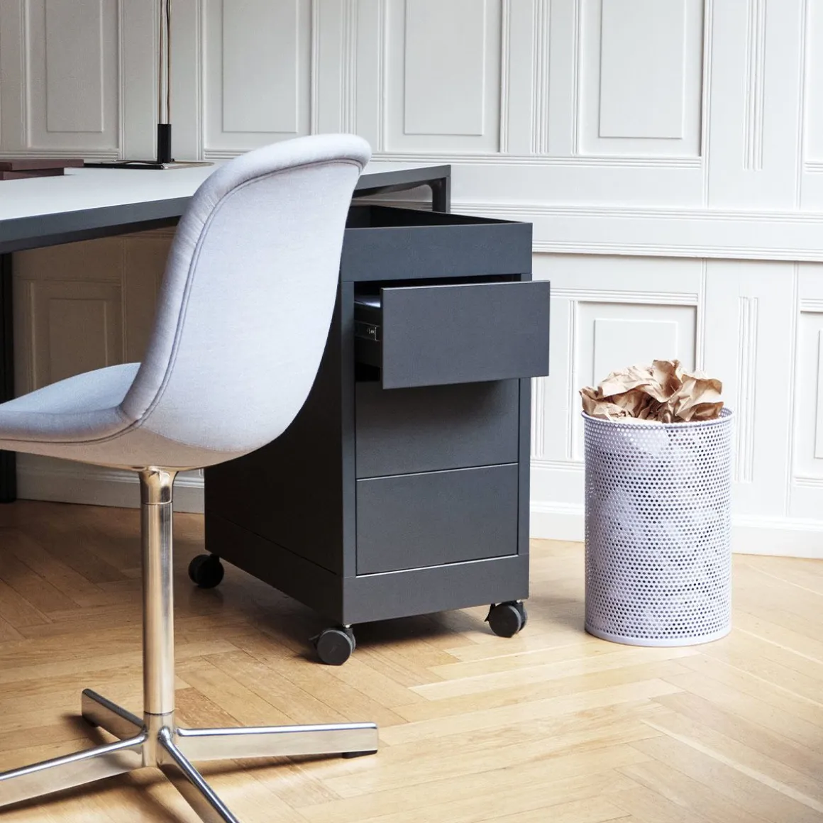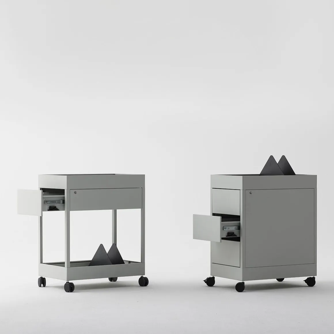 CHARIOT New Order de Hay. Les chariots mobiles New Order sont dotés d’un plateau supérieur et sont livrés avec un seul tiroir et une étagère ouverte en dessous, ainsi qu’une unité fermée avec trois tiroirs. Les deux modèles sont compatibles avec les accessoires de plateau New Order et sont équipés d’un système de verrouillage.