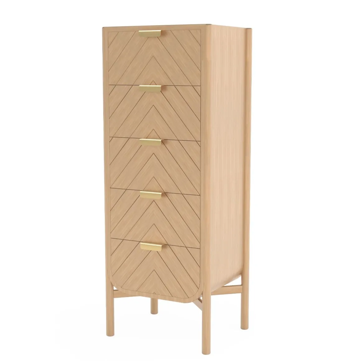 Le chiffonnier Marius, tel un pilier orné de rainures obliques, habille votre pièce de la présence solaire, stable et douce. Marius hisse la grand-voile tout au long de ses 4 tiroirs pour vous offrir plus que de simples rangements : Marius est un voyage contemplatif, une redécouverte de votre intérieur. Son design si juste, inspiré de l’univers maritime et des coques de bateaux, voguera avec grâce et poésie d’une pièce à une autre : dans une chambre ou une chambre d’enfant, dans une pièce à vivre, un bureau, une entrée. Le chiffonnier Marius sera partout chez lui et bercera vos pièces de sa douce présence. Le chiffonnier Marius est conçu au Portugal dans un atelier d’ébénisterie. Ses quatre tiroirs, en plaqué chêne clair, teinté noir ou noyer sont tous ornés d’une poignée en métal à la finition laiton brossé. Marius est une création du designer français de Pierre-François Dubois.