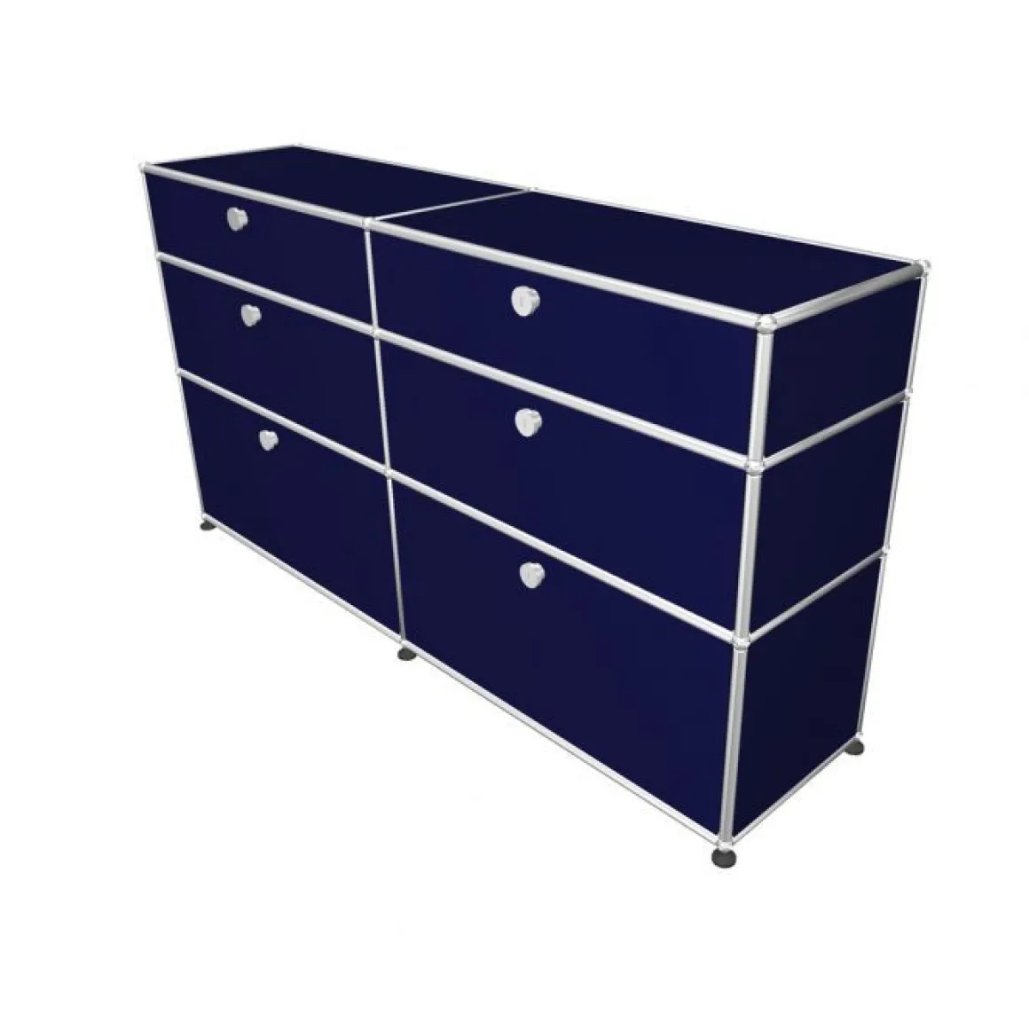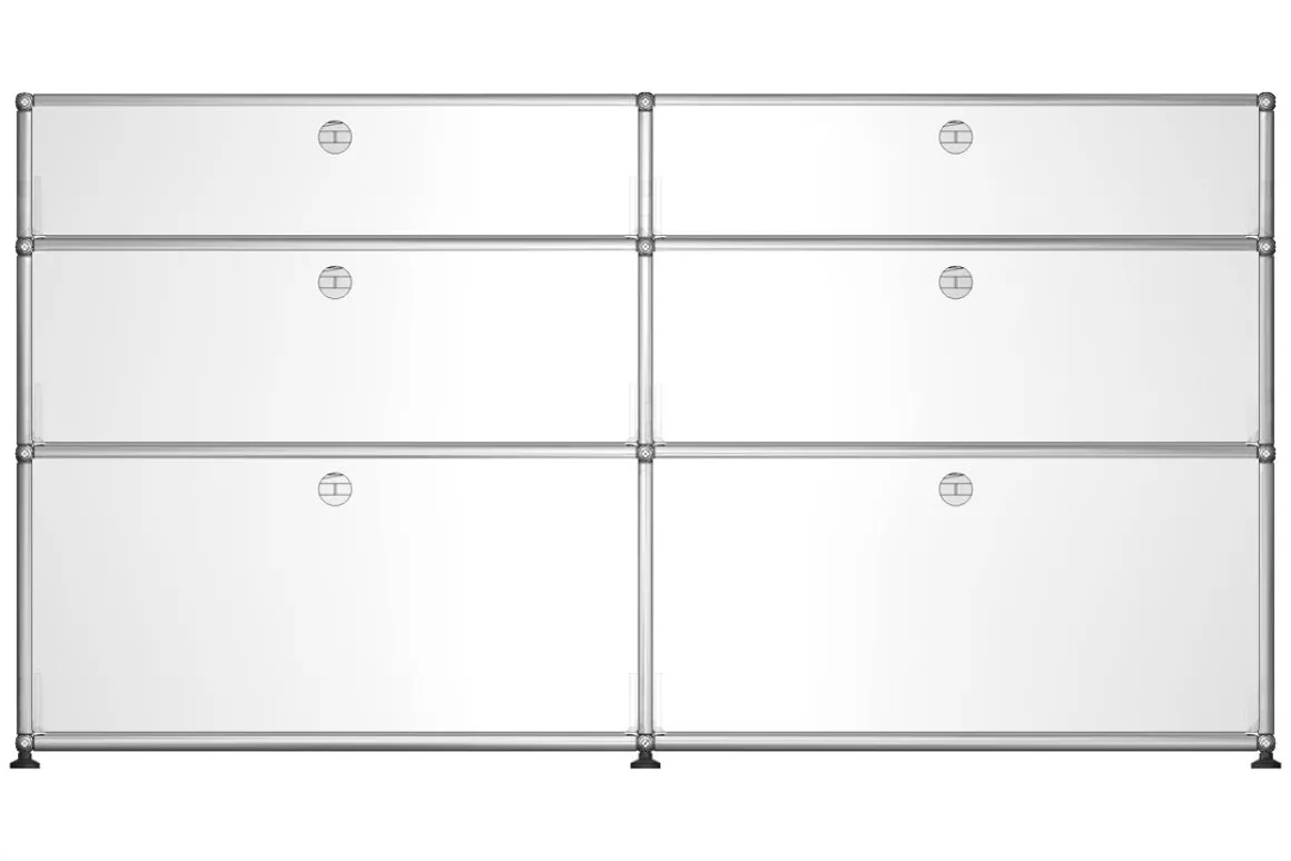 Une boule chromée constitue le centre d’articulation de l’ensemble du système d’aménagement USM Haller. Point de jonction névralgique d’un système de tubes de différentes longueurs elle permet la construction de meubles en 3 dimensions, divers et uniques dans leur forme comme dans leur utilisation. A cette structure porteuse modulaire se rajoutent des éléments de parement en tôle laquée époxy ( 14 coloris) ou en verre, des éléments d’aménagement intérieur et un ensemble de portes ou tiroirs vient terminer la composition. Chaque parement USM peut être de couleur différente.