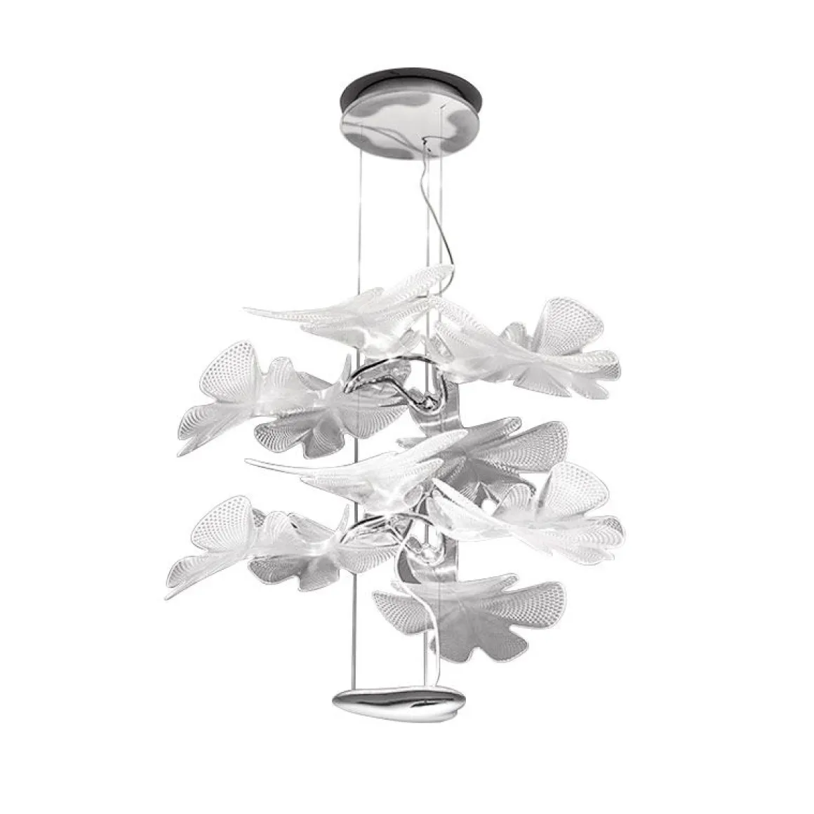 La suspension Chlorophilia, présentée en 2015, définit un principe optique dont la composition peut être répétée en multipliant les éléments pour créer des ensembles qui se développent dans l’espace environnant. Chlorophilia 2 double la surface transparente qui est ainsi sur deux niveaux pour une présence beaucoup plus scénique. Chlorophilia est l’une des dernières créations de Ross Lovegrove qui confirme une nouvelle fois ses inspirations puisées dans la nature et son approche très personnelle. Ses influences sont bucoliques, ses formes : organiques et fluides. C’est une suspension fortement scénographique mais légère. Ses trois éléments disposés en éventails qui se superposent se révèlent une fois allumés, lorsque la suspension dévoile ses jeux d’ombres délicates qui interagissent avec l’espace. Elle se compose d’un corps qui contient une LED COB faisant office de dissipateur et d’élément phytomorphique. Le corps central suspendu émet une lumière indirecte, filtrée et réfractée par les surfaces transparentes qui, par leur forme rappellent des éléments naturels ; des feuilles par exemple, confirmant que la nature est une véritable source d’inspiration pour ce designer. Il signe là un luminaire à fort potentiel scénographique ainsi qu’un bon rendement lumineux dans la pièce qu’il occupe. Les éléments composants Chlorophilia peuvent se répéter en les multipliant pour créer des luminaires qui habillent l’espace sur plusieurs niveaux ou s’étendant en ampleur. «Une installation de feuilles optiques conçue comme une fusion de géométries naturelles et artificielles. La lumière devient interactive à travers la projection caustique sur le plafond créant ainsi un effet lumineux délicat et féminin. » Ross Lovegrove.