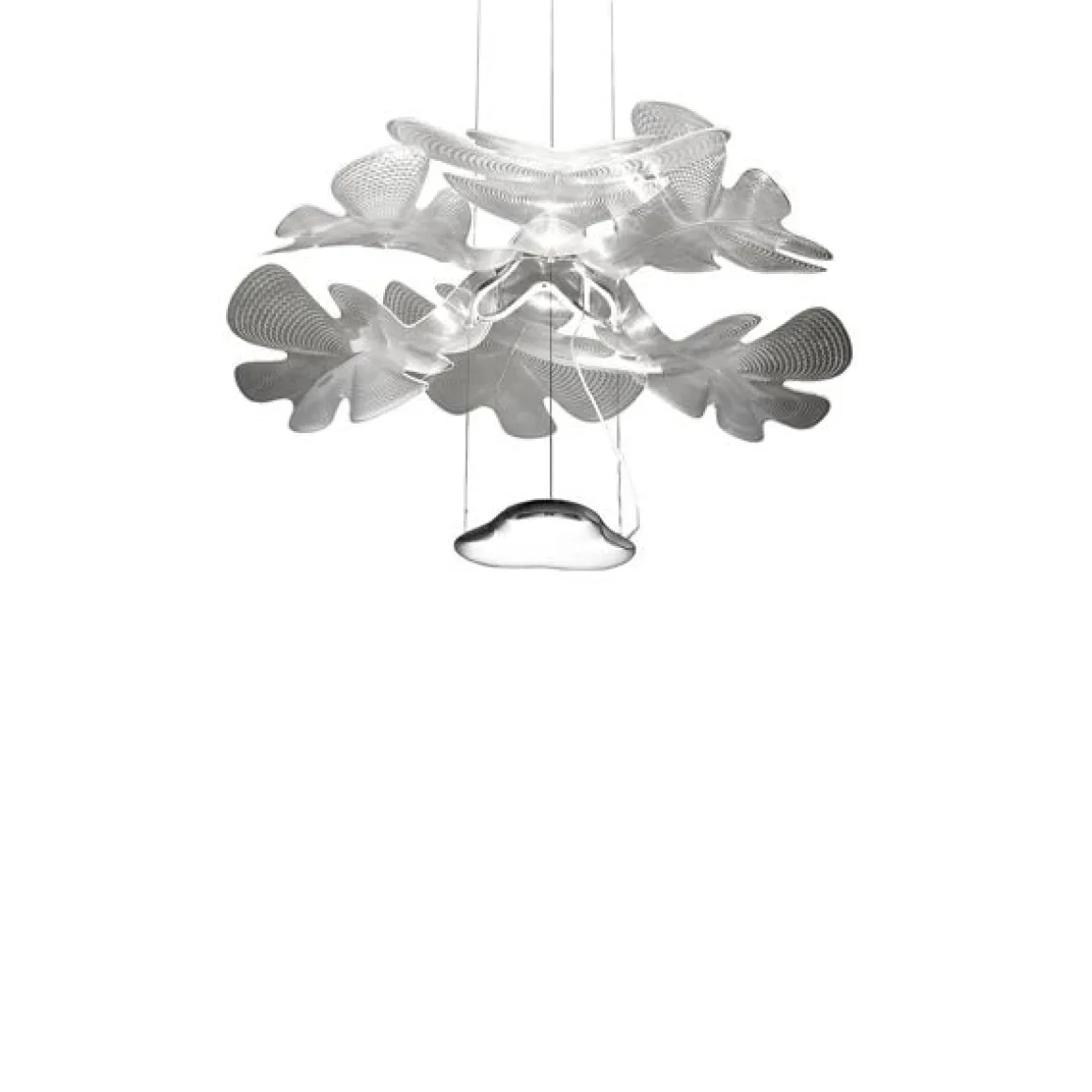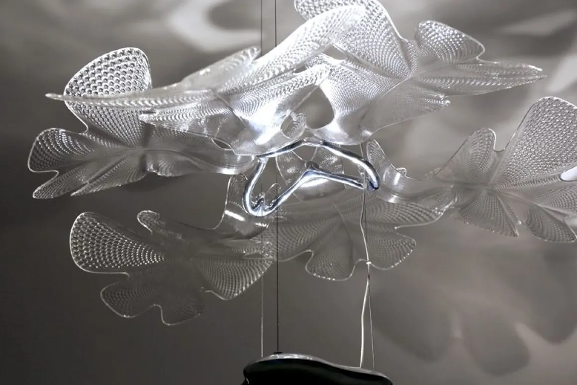 Chlorophilia est une nouvelle création de Ross Lovegrove qui, encore une fois, interprète la compétence d’Artemide dans le light engine du corps lumineux, avec sa griffe qui lui est si propre : ses inspirations bucoliques, ses formes organiques et fluides. C’est une suspension fortement scénographique mais légère. Ses trois éléments disposés en éventails qui se superposent se révèlent une fois allumés, lorsque la suspension dévoile ses jeux d’ombres délicates qui interagissent avec l’espace. Elle se compose d’un corps qui contient une LED COB faisant office de dissipateur et d’élément phytomorphique. Le corps central suspendu émet une lumière indirecte, filtrée et réfractée par les surfaces transparentes qui, par leur forme rappellent des éléments naturels ; des feuilles par exemple, confirmant que la nature est une véritable source d’inspiration pour ce designer. Il signe là un luminaire à fort potentiel scénographique ainsi qu’un bon rendement lumineux pour la pièce qu’il occupe.Les éléments composants Chlorophilia peuvent se répéter en les multipliant pour créer des luminaires qui habillent l’espace sur plusieurs niveaux ou s’étendant en ampleur.