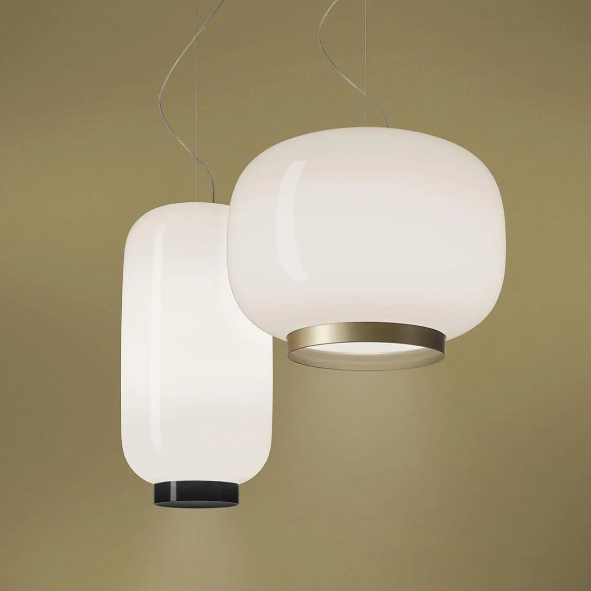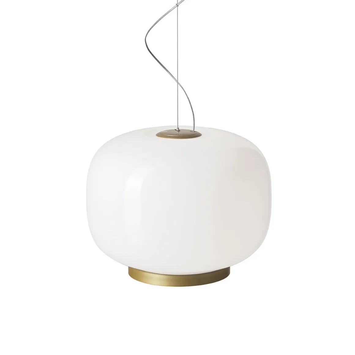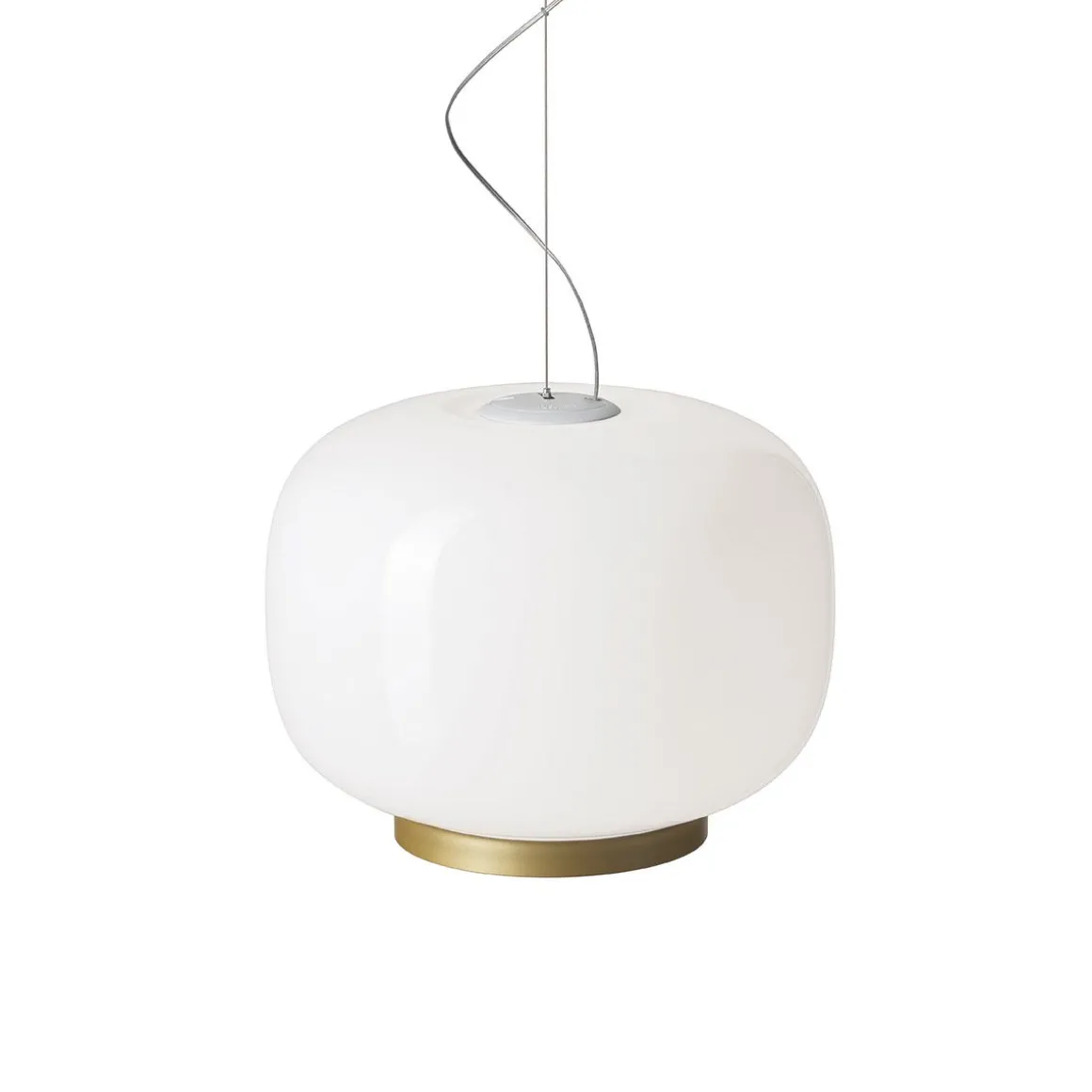 Lampe à suspension pour un éclairage diffus et direct vers le bas. Le diffuseur est en verre soufflé chemisé avec une finition enduite brillante. Câble de suspension en acier inoxydable, fil électrique transparent. Plaque de plafond avec support en métal galvanisé, recouverte d’ABS blanc brillant maîtrisé, ou coordonnée en or pour Chouchin Reverse 1