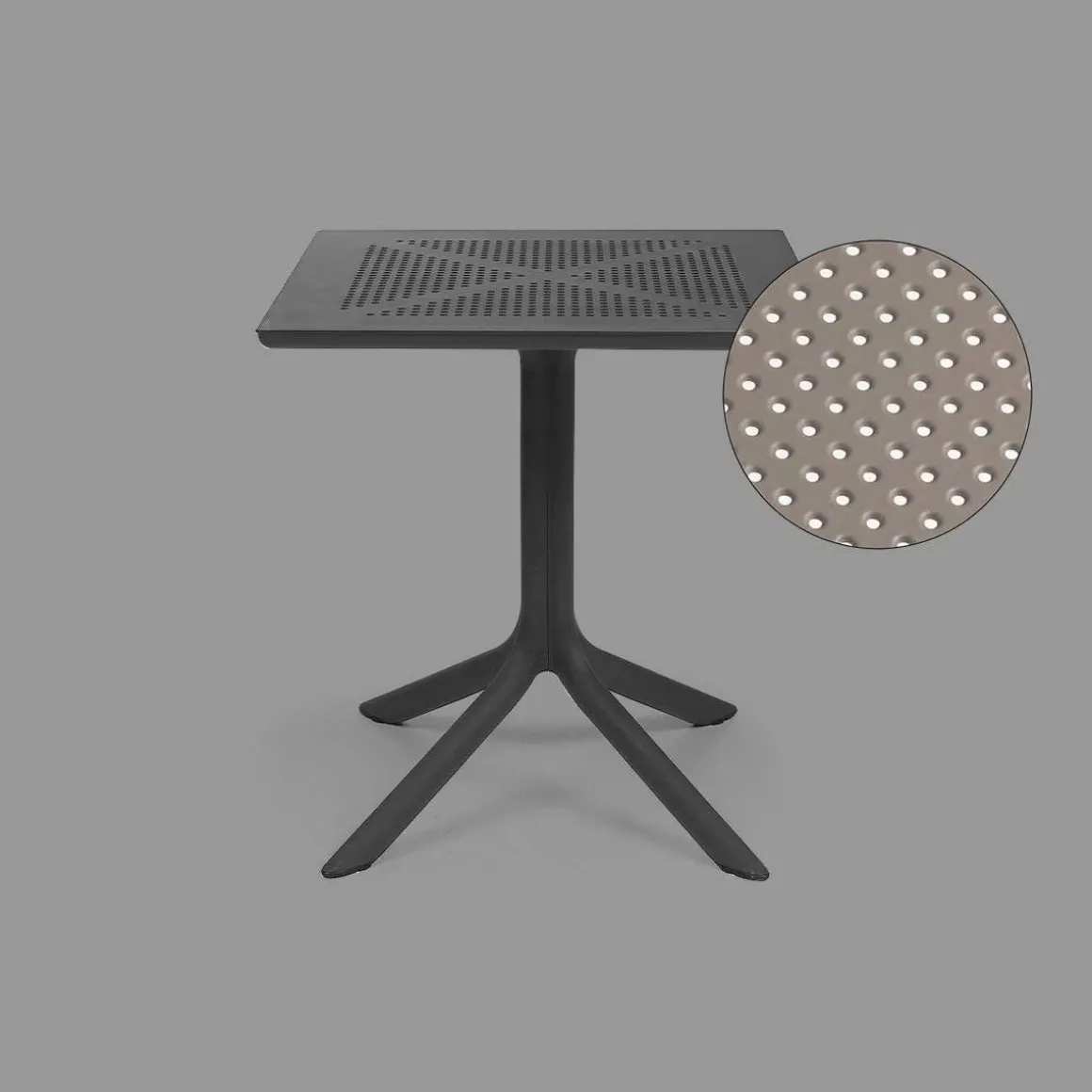 Clip 70 de Nardi par Raffaello Galiotto. Conçue tout spécialement pour occuper peu d’espace, Clip est une table carrée professionnelle en résine fibre de verre, à pied central à quatre branches, dotée d’un plateau DurelTop comportant un motif à cercles ajouré photogravé.